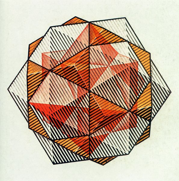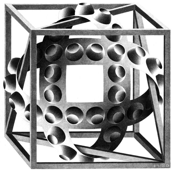 Editor: This is M.C. Escher's "Concentric Rinds," created in 1953, an ink and graphite print. The complexity is mesmerizing, almost dizzying. What symbolic weight does this seemingly infinite orb carry? Curator: Indeed. The sphere itself is a potent symbol, isn't it? Representing wholeness, the universe, the self… But Escher fractures that totality. Do you notice how the rinds, or bands, segment the sphere? Editor: Yes, they remind me of longitude and latitude lines on a globe, but more chaotic. Curator: Exactly! Consider the psychological impact of that broken wholeness. The ordered lines promise a map, a system, yet the internal structure feels like an impossible object, resisting clear interpretation. How does this tension resonate with you? Does it trigger a feeling or association? Editor: It feels like a quest to understand something inherently unknowable, the internal structure feels so detailed and complete, like you could dive in, yet so confusing to even look at. Like life, in a way? Curator: An astute observation. The work touches on something deeply human, this desire for understanding weighed against the vast unknown. The tension makes the art really engaging. Editor: I see it now. Thanks for pointing out how Escher uses familiar symbols to evoke this sense of cognitive dissonance, leaving you perpetually trying to decode it. Curator: Absolutely, that push and pull of comprehension is key to Escher's work. The beauty resides in its unresolvable nature.