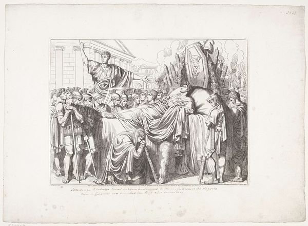 Curator: This engraving, "Marcus Atilius Regulus vertrekt naar Carthago" by Bartolomeo Pinelli, was created in 1817, utilizing an engraving technique. The figures seem frozen in their grief. How do you interpret this scene? Editor: Well, seeing that this is a print, it really makes me consider the labour that went into its production and its place within a wider system of image-making at the time. It's so detailed! Curator: Exactly! The choice of engraving, a painstaking process, emphasizes the value placed on skilled labor. It's a far cry from the mass-produced imagery we're used to today. Considering the depicted scene involves Regulus's departure for Carthage – essentially facing possible death – the method mirrors his sacrifice through the engraver's dedication to their craft. Don't you agree? Editor: That's interesting. So, the act of creating this image by hand—the meticulous cuts in the plate—resonates with the self-sacrifice of Regulus himself? But isn’t it just a more affordable medium compared to painting for the middle classes? Is Pinelli emphasizing accessibility through the reproducible medium of printmaking? Curator: An excellent point! The relatively accessible nature of prints expanded viewership and democratized the story, allowing wider audiences to consume narratives of Roman virtue. It also prompts consideration on the labor involved in making the story accessible and how this shapes its value, perhaps more so than a painting reserved for a private collection. Does it make you consider how stories were disseminated at that time, and by whom? Editor: Definitely. I’m realizing I need to look at the medium itself, this engraving, and its cultural context in order to better understand Pinelli’s narrative. It makes me think of the contemporary prints and posters during the French Revolution.