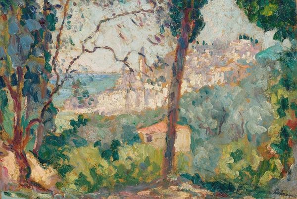 Curator: Before us, we have Paul Cézanne’s “Cote du Galet, at Pontoise,” an oil painting from 1880. Editor: It's undeniably serene, a very digestible landscape that soothes the eyes—although something about it feels unsettling, almost structurally rigid. Curator: I agree about its restful qualities, but rigidity might not be the right word; I think that what we're observing here are actually just highly organized visual forms that offer an illusion of depth. Cézanne was attempting to move away from the pure Impressionistic style toward something with a more lasting order and a heightened emotional or expressive content. Editor: Fascinating. The placement of the geometric houses gives me this uneasy feeling. Is it some kind of distorted utopia? Is this how societies viewed idyllic settings during an age of increased industrialism? I'm curious to know whether its original audiences had a similar visceral reaction. Curator: Consider also how Cézanne utilized planes of color. See how each brushstroke works almost like a building block. He wasn't just capturing light; he was also building volume. The symbols may reside in these forms themselves, indicating something elemental about place and perspective. Editor: That makes perfect sense! These are very unconventional impressions that go against typical landscapes. The symbolism in this town's architectural geometry shows a fascinating new dimension. I also appreciate how his mark-making embodies more significant themes of perception, memory, and human interaction with the landscape. It really speaks to how societies construct meaning within familiar surroundings. Curator: Indeed. This piece showcases Cézanne's distinctive perspective. Looking at it has allowed me to reconsider how visual forms construct the way we view the world and express emotions through them. Editor: Likewise. Seeing "Cote du Galet, at Pontoise," from a historical perspective offers interesting insights into society, nature, and the politics that underpin perceptions of place. It truly is amazing how art transcends time.