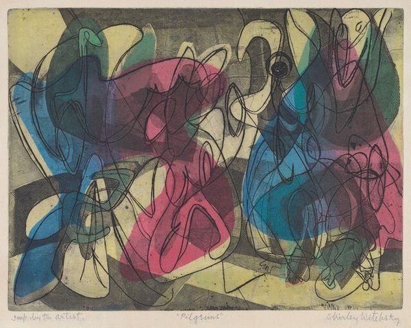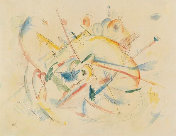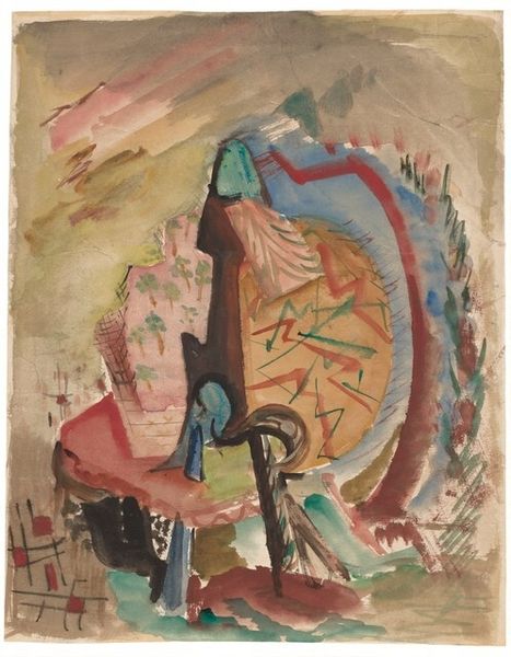 Curator: We're looking at "Abstraction," a watercolor and drawing created around 1917 by John Marin. Editor: It has an intriguing, almost unstable quality. The geometric forms seem to collide and fracture. The cool, translucent colors also contribute to this overall feeling of dynamic disarray. Curator: Marin's move towards abstraction can be viewed within the historical context of early 20th-century artistic experimentation. This period was defined by the dismantling of representational traditions as artists responded to profound socio-political shifts and emergent technologies. Abstraction, for many artists like Marin, became a way to visualize the experience of modernity itself – its speed, energy, and fragmentation. Editor: Yes, but I find the dynamism of this work emerges most clearly through its internal relationships. See how he contrasts areas of intense blue and pink against quieter passages of gray, while yellow slashes are activated, visually disrupting any potential stillness. Curator: I agree. Considering the impact of urbanization, industrialization, and the burgeoning political movements during Marin’s time, we can also understand this piece as a kind of commentary on societal structures. Perhaps the fracturing shapes symbolize a breaking down of established norms and hierarchies. The overall feeling of transience and tension seems representative of the instability felt across many sectors of society. Editor: Interesting, and yet there's also something joyous here. These colors—even applied in a somewhat chaotic manner—carry a visual intensity that really enlivens the whole picture plane. This inherent vibrancy, to me, speaks to something beyond pure chaos or disruption. Curator: Yes, looking closer at Marin's integration of color theory, and particularly its intersections with symbolism from a historicized perspective, brings to light the tensions within his era of radical societal transformations that either lead to creative opportunity or political crisis. It seems to signify more than mere disruption. Editor: So, beyond its socio-historical placement, perhaps the painting resides precisely in that formal tension; creating dynamism and hinting at stability while maintaining a captivating ambiguity. Curator: Ultimately, Marin gives us a snapshot into an era undergoing constant negotiation for social and aesthetic purpose, while opening up further explorations into those avenues and discussions within modern society as we still understand it today.