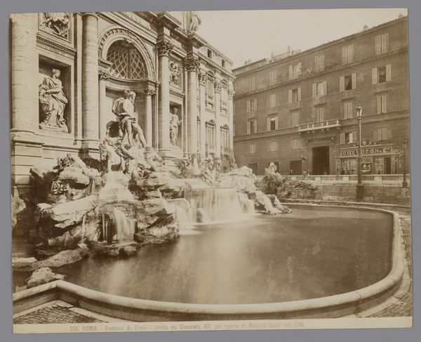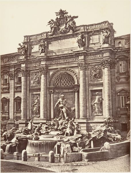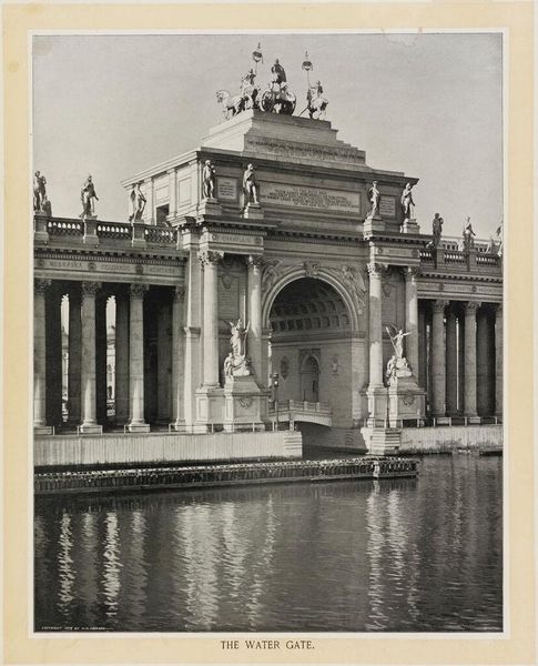 Editor: This photograph, taken by William Henry Jackson, captures the Northwest Corner of the Agricultural Building at the World's Columbian Exposition. It evokes a sense of grandeur, almost like a classical utopia. What symbols stand out to you in this image? Curator: The Atlas figure atop the building immediately draws my eye. Atlas carrying the globe is such a potent symbol, embodying the weight of the world, of responsibility. What does it suggest to you, placed above a building dedicated to agriculture? Editor: Maybe it represents agriculture as a global burden or responsibility? A classical reference in America sounds a bit ironic. Curator: Precisely! It’s about the aspirations of a nation, a symbolic claim to global power and influence, expressed through the visual language of classical ideals. It’s a statement about America’s place in the world. Does that reframe how you see the building and the photograph itself? Editor: Absolutely. It's more than just a nice picture; it's a visual manifesto of ambition. Curator: Indeed, and that ambition is layered with cultural meanings that continue to resonate.
