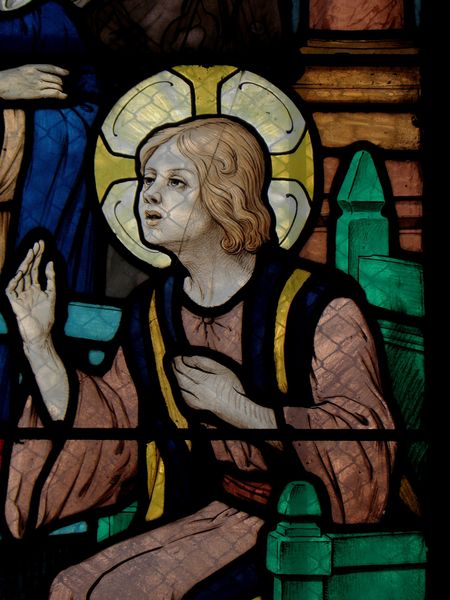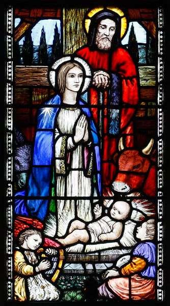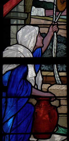 Curator: This stained glass detail is by Ludovic Alleaume, completed in 1919, depicting "Jesus and the Samaritan woman" at the Église Saint-Sulpice de Fougères. The pale luminescence radiating from Jesus immediately captures attention. What are your initial thoughts? Editor: Well, it’s clearly striking—the lead lines holding the glass together create this almost brutal geometric scaffolding. It clashes strangely with the subject, almost imprisoning it. The materials feel heavy. Curator: Absolutely. The leadlines do serve a practical structural function, but here they amplify the narrative. Consider how Alleaume has employed medieval archetypes; this scene, rich in symbolic meaning, focuses on Jesus’s spiritual authority, even over established social norms. Editor: So, even in the early 20th century, artists were returning to pre-industrial forms and subjects. What did engagement of artists like Alleaume mean at the time it was made in the wake of a conflict that relied so completely on modern manufacturing? Curator: That’s insightful. This glass functions as more than simple decoration; it represents faith in the face of modernity’s disruptive forces. The return to figuration connects the viewers to historical and spiritual values. Notice the subtle palette-- blues, reds, pale ambers – it evokes serenity. Editor: Yes, but it's a restrained palette; almost muted compared to, say, Chartres. Look closely— the texture in Christ’s robe almost resembles hammered metal. This panel then isn’t simply about piety, but it’s very self-aware about its process. Curator: Indeed. Alleaume, masterfully using the medium's constraints to express both divine presence and human connection. We've witnessed the enduring power of symbolic visuality and the tangible impact of its construction. Editor: Ultimately it showcases the enduring nature of artistic innovation—both through symbol and stuff.
