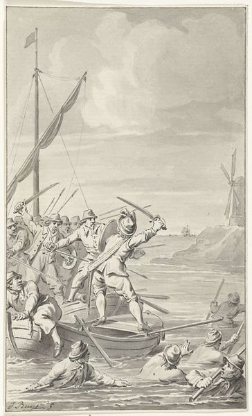 Curator: This coloured print from between 1762 and 1826, now in the collection of the SMK, is titled "Cort Adeler dræber den tyrkiske admiral," or, "Cort Adeler Kills the Turkish Admiral." Editor: My first thought is the composition: so theatrical, almost staged, like a propaganda play intended to reinforce national pride. The pale colours almost belie the violence of the scene. Curator: Right, Niels Truslew here employed the media of aquatint and coloured pencil in tandem. It is interesting how those decisions flatten and heighten the depicted space. You see that in the treatment of the smoke from the cannons blurring figures together into a singular chaotic event. How do these choices shape the meaning of the print for you? Editor: I am particularly drawn to the figure of Adeler standing over the admiral. Think about the power dynamics: the literal stamping of dominance. This act is then framed within a larger historical context of power and cultural conflict. What narrative of victory is being crafted and for whom? Curator: Agreed. The work’s reliance on relatively inexpensive printmaking methods and coloured pencil point to the social circulation of images, reaching wider audiences and shaping popular consciousness. The labor required for aquatint also must have required considerable craftsmanship—a combination of artisanal and reproductive techniques. Editor: Absolutely. Beyond just documenting a historical event, it embodies the construction of heroism and villainy along very clear national and cultural lines. It makes me reflect on who controls the narrative and whose stories get told, and what those choices reveal about broader societal power structures. Curator: I think approaching this print as a document of making and reproduction and its status as an accessible, circulating image complicates the typical understanding of 'high' art as singular or uniquely produced. It prompts me to investigate its multiple originalities through the labor that allowed this to occur. Editor: Yes, by acknowledging the multifaceted nature of a print like this, we confront art history's role in constructing and perpetuating potentially biased historical accounts and how material considerations affect it. Curator: A perfect ending to our little material and social examination here. Thanks! Editor: Indeed. I think considering artworks from varied perspectives allows for a much richer understanding of history.