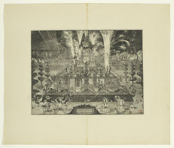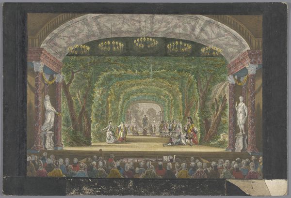 Curator: Ivan Bilibin, a key figure in the Russian Avant-Garde movement, created this watercolor and ink drawing titled "Chernomor's Gardens. Sketches of scenery for Mikhail Glinka's Ruslan and Ludmilla" in 1913. The artwork reflects a convergence of Art Nouveau and Orientalist styles. Editor: Wow, this gives off serious fairytale vibes! It's dreamy, theatrical…like a stage set waiting for the actors to appear. That archway framing the waterfall is pure magic. Curator: Precisely. Bilibin designed this as a set piece for Glinka’s opera based on Pushkin’s poem. He merges Russian folklore with elements drawn from Asian art traditions, particularly evident in the detailed foliage and architectural motifs. It is interesting to observe, as well, the lack of visible labor—no gardeners tend to this fantastic world. Editor: The colour palette feels unusual too – that muted green is offset by the almost artificial looking blue, creates this wonderful otherworldly atmosphere, don’t you think? Like we're peering into a dream. There's a loneliness about the scene as well; you want to walk right into the painting and give some company to that golden statue! Curator: Yes, I concur on all accounts. The combination of cool blues and verdant greens further enhances the sense of an enchanted space, set apart from reality, and emphasizes the artwork’s link with Russian folk stories, such as powerful enchanters’ realms and the presence of supernatural beings. The idealized vision removes lived-in, unmanicured textures, which gives us pause when interpreting it within its own social and temporal landscape. Editor: You know, it makes me wonder about Bilibin himself. What kind of headspace do you have to be in to imagine places like this? There’s almost a melancholic longing within those carefully drawn lines, wouldn't you say? Curator: Absolutely. Seen in context, we could argue that "Chernomor's Gardens" encapsulates a yearning for an idyllic escape, away from pre-revolution tensions—although, Bilibin seems conflicted when situating figures, class, or culture into this fantasy. The stage, whether physical or emotional, may also provide avenues of escape and expression otherwise not permitted. Editor: That really gets you thinking, doesn't it? It seems Bilibin’s created a secret door we've been invited to peek into. I can almost hear the music... Curator: Indeed. I am struck once more by how artistic creations contain the power to evoke such diverse narratives and inquiries, from personal fantasy to cultural critique.