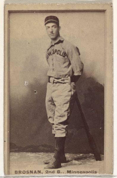 Curator: Well, if this isn’t a blast from the past! We're looking at an 1895 albumen print card, a piece from P.H. Mayo & Brother's baseball series, N300, which features T.W. Corcoran, shortstop for Brooklyn. Editor: There’s something so endearing about the sepia tones, it casts such a gentle melancholy on the player’s face! It's like seeing a ghost of the sport’s origins, isn't it? Curator: The albumen print lends a distinct tonal range; see how the light delicately models Corcoran's features against the darker backdrop? The texture is exceptionally smooth for the era. Editor: But what do you think it meant to immortalize an athlete this way? I imagine baseball heroes became gods to the ordinary folk... Do you suppose T.W. ever imagined his face would hang in the halls of a place like the Met? Curator: Likely not! Remember, these cards were originally inserts in tobacco products—part advertising, part collectible. It’s a fascinating fusion of commerce and culture. Note the direct gaze, capturing an attitude— stoicism, determination? It's intriguing how portraiture intersected with burgeoning sports fandom. Editor: It makes one think how every athlete wants to transcend the game. Perhaps being attached to "Mayo’s Cut Plug" isn’t quite the grand aspiration... Though hey, smoking and baseball? The times, they are a’changin’, but somethings never leave you, don't they? Curator: Indeed. Also consider, this portrait is printed alongside bold text—both the team name, "BROOKLYN," and, quite pointedly, "For Chewing and Smoking." The typography, its size and placement, serve as another focal point on the card itself, demanding that the commodity of advertisement be viewed beyond the portrait of Corcoran, and further extending towards a material culture embedded in a commercial network. Editor: From our distant perch, a picture is like a message in a bottle, a time capsule of fleeting greatness and the human condition! So poignant, the way this mass produced image survives... almost defies the transience it seems to accept so readily! Curator: An evocative insight. It makes me reconsider what this small card meant, back then, as well as what it signifies now. A neat little encapsulation. Editor: Couldn't agree more, now what else do you got stashed up those sleeves?