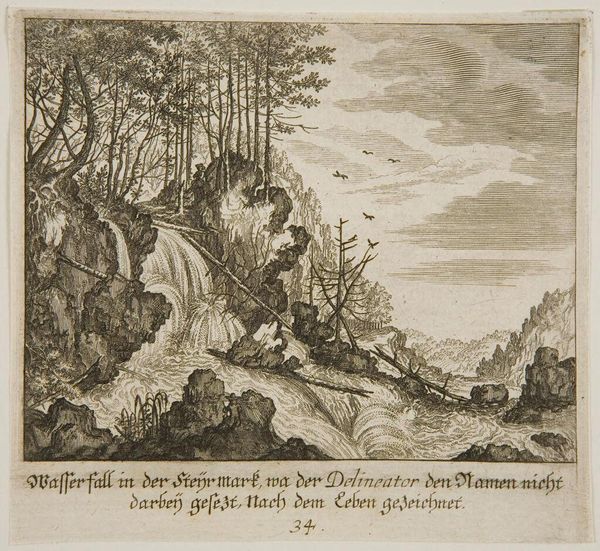 Editor: This is Melchior Küsel's "View of the Large Waterfall in the Lower Schwanburger Alps, Two Hours from the Schwanburg," a small etching. It’s incredibly detailed for its size, but the cascading water feels almost oppressive. What’s your interpretation? Curator: It’s interesting you find it oppressive. Think about the historical context. Such depictions of nature were often commissioned by the elite. How might the ownership and control of land factor into our understanding of this image? Editor: So, the waterfall maybe isn't just a scenic view, but also a sign of power or wealth? Curator: Precisely. Consider the labor potentially extracted from the landscape, the resources controlled. Who benefits from this 'view'? And who is excluded? Editor: I never considered the social implications of landscape art before. Thanks for broadening my perspective! Curator: And thank you for bringing your fresh eyes to this etching. It's in these dialogues that we unravel deeper meanings.