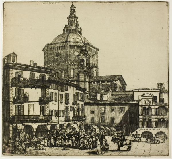Donald Shaw MacLaughlan made this etching, Pavia, at an unknown date, and it's a real testament to the art of seeing. The entire piece is a network of these fine, etched lines, creating a world out of texture and tone. You can almost feel the rough surface of the buildings, the movement of the people in the square, the sheer weight of that incredible dome. The subtle variations in the ink create depth, the contrast between light and shadow bringing the scene to life. The light feels really specific, like that particular time of day, the sun hitting the dome just so. And check out the way he includes these almost dreamlike sketches in the top left, studies of heads and figures, a peek into the artist's process. It reminds me of Piranesi's architectural prints, in the way that he captures the grandeur and the grit of a place. But it's also deeply personal, an intimate record of the artist's encounter with Pavia. Art is just such a cool conversation across time.