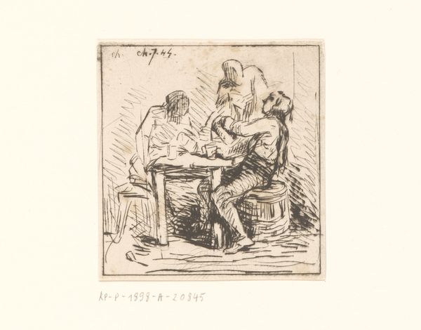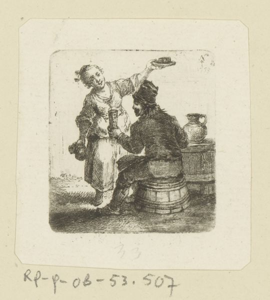 Editor: We’re looking at "Sitting Man with Cup and Woman with Pitcher and Plate," a 1773 engraving by Johann Andreas Benjamin Nothnagel. It feels very intimate, almost like we're peering into a private moment. What do you make of it? Curator: It’s a fascinating snapshot of 18th-century life, wouldn't you agree? We see this everyday scene elevated through the medium of print. Think about who would have accessed such an image: not the subjects themselves, likely, but a growing middle class eager to consume representations of different social strata. Do you think it exoticizes their lives? Editor: That's an interesting point. It does feel like it might be playing into certain stereotypes, but I can't put my finger on exactly which ones. Curator: Consider the conventions of genre painting. Often these images served a didactic purpose, reinforcing social hierarchies through representations of labor and leisure. What's the body language communicating to you? The woman’s elevated arms holding a tray with a drink. Does it reflect power dynamics between genders? Editor: I see what you mean. Her gesture could be interpreted as subservient. But there's also a kind of openness in her face, an almost theatrical presentation of the scene. Curator: Exactly! This ambiguity is key. These images were circulated and interpreted within complex social and political contexts. They were never neutral reflections, but active participants in shaping perceptions. Thinking about what public role images were thought to perform. Editor: I hadn't really considered how the act of making and circulating these prints could have been part of the power dynamic. Thank you. Curator: And thank you, it helps shed light on how this work might be both document and performance.