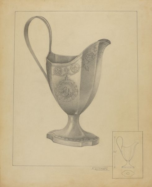 Curator: Editor: Here we have Giacinto Capelli’s "Silver Creamer", from around 1936, a pencil drawing on paper. What strikes me is the detail, especially considering it's just pencil. It looks so much like the actual metal. What do you make of it? Curator: Well, given the medium, let’s consider this as a document of labor. Someone painstakingly rendered this object with a clear intent to capture its material presence. Does that inscription give you any clue about its function as a display of wealth, of some commission, perhaps? Editor: It's ornate but almost diagrammatic. Like a blueprint for the object, not necessarily about using it to serve cream. Curator: Exactly! Think about the social context of design in the 1930s. Decorative arts often blurred the lines between industry and art. This drawing may be a record of an object for reproduction or study. What does its starkness tell you about its original environment? Was it meant for advertising? Or archival use? Editor: I hadn't considered its purpose beyond simple representation, but the drawing’s almost technical quality makes me think it served some function for designers or artisans working with silverware. It focuses attention on the construction and design of the piece. Curator: Precisely. We can really see here the artistry *in* the making. Silverware carries cultural and class connotations; the drawing presents a sanitized ideal of the object. Do you think the pencil and paper change our understanding of its preciousness compared to if it were an image, a photograph? Editor: Good question! I suppose there's an emphasis on the handcrafted nature of the process rather than pure display. The artist is also performing skillful labour to create the impression of this silver object! It feels like it complicates our relationship to consumerism and hand-making. Curator: It does, doesn't it? That the cream pitcher and monogram drawings, the attention given to this seemingly simple object, demonstrates complex interaction between representation, materiality, and social practice. Editor: I agree; looking closely at its making definitely shifts the way you see it, it's not *just* a pretty drawing.