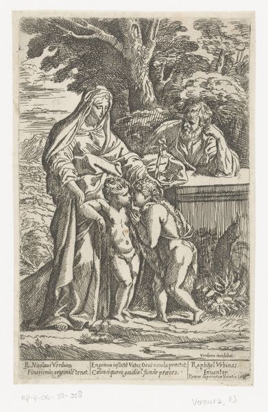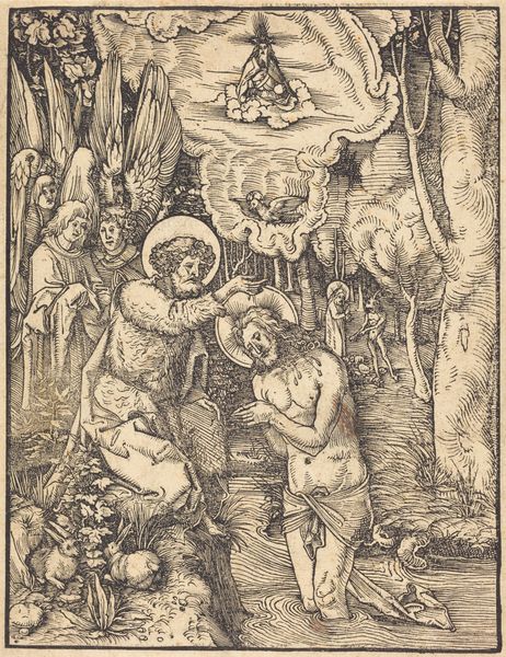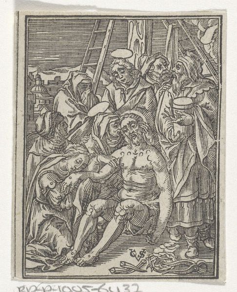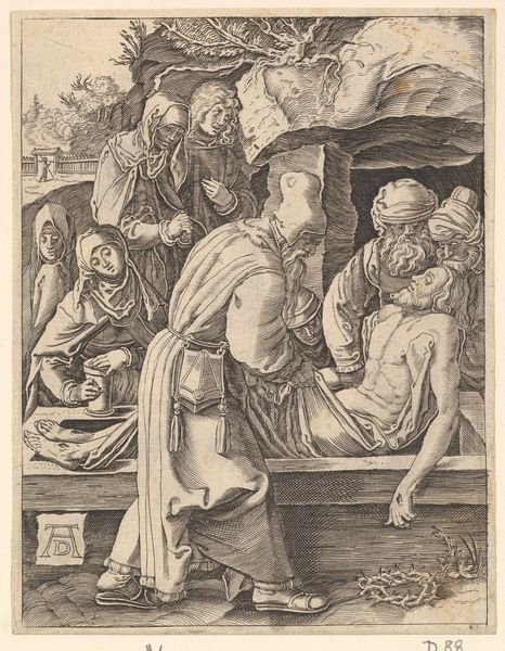Curator: This engraving, dating to 1507, is entitled "The Lamentation, from The Passion" and was created by Albrecht Dürer. It's currently housed here at the Metropolitan Museum of Art. Editor: The first thing that strikes me is its incredible intensity for such a small, monochromatic piece. It really pulls you into this intimate moment of grief. Curator: Indeed, Dürer's masterful handling of the engraving technique creates a depth and texture that is truly remarkable. Think about the process: the physical labor, the specialized tools and training required to incise these fine lines into a metal plate, then the press to transfer the image. Each print represents a stage in a complex production. Editor: And considering the period, its historical context adds layers of understanding. We must consider Dürer’s own socio-political circumstances as well as the societal expectations on religion. Images like these functioned within networks of exchange, contributing to a wider understanding of suffering and Christian values, while reflecting a complex cultural hierarchy. Curator: Precisely. Consider the varying expressions. There's such incredible control here of conveying human emotion. Editor: Looking closely, I can’t help but notice that Dürer signs his work so visibly in the foreground on what appears to be a tombstone. It does bring a sense of artistic pride to a painful scene, complicating how one understands the message of devotion versus recognition of labor. Curator: But does that pride in artistry somehow diminish the message of suffering or humanizes it? To produce prints en masse was a business of faith—literally for religious dissemination, as well as commercial sustenance. It's that complex interplay between commerce, the social messaging of faith, and craft that makes this a compelling work. Editor: It speaks to how artworks navigate complex roles – as objects of veneration and reflections on historical contexts. Dürer’s masterful technique and symbolic representation invite reflection. Curator: I agree, and recognizing all those complexities and interplays deepens our understanding. Editor: It certainly changes how we view something as ostensibly simple as a black-and-white engraving.