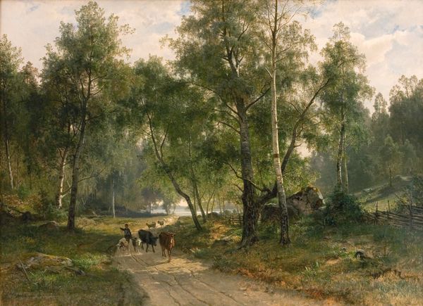 Editor: This is George Inness' "Fleecy Clouds," painted in 1881. Looking at it, I feel this deep sense of serenity, almost melancholy, in the way the light catches the clouds and filters down through the trees. What do you see in this piece? Curator: Serenity, yes, but I also sense a certain wildness simmering just beneath the surface. Those clouds aren't just fleecy; they're pregnant with a potential storm. Inness often used landscape not just to depict a place, but as a mirror reflecting our inner emotional landscape. Does the path winding into the distance invite or intimidate? I see both possibilities. Editor: I hadn't thought about the "storm" aspect—I was too caught up in the diffused light! That contrast makes it so much more interesting. The path… I think I felt it more inviting, a chance to wander. Curator: Precisely! And that tension is exactly what makes Inness such a compelling artist. He captures not just the seen world, but the unseen—the vibrations, the moods, the very soul of a place. Think of him whispering secrets of nature with his brush. And you, dear Editor, become part of that listening process, don’t you think? Editor: That’s beautifully put. I will look at it in another way now! Curator: As with nature itself, new layers continually reveal themselves when we allow ourselves to just...observe.