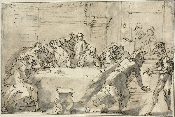 Curator: This line etching by Gérard de Lairesse, held in the Harvard Art Museums, depicts the Adoration of the Magi. What's your immediate reaction? Editor: It feels very active, almost chaotic. The lines are so dynamic, creating a sense of movement and urgency. It’s not the serene scene I usually associate with this subject. Curator: Indeed, it challenges conventional depictions. Lairesse, a Dutch Golden Age painter, imbues the scene with an energy reflecting the era's burgeoning merchantile spirit and its impact on religious art. Look at how the magi aren't just presenting gifts, but actively engaging, almost negotiating. Editor: And that throng of onlookers in the background – are they witnesses, or perhaps a commentary on the public's involvement in religious spectacle? The composition feels almost like a stage, highlighting the performative aspect. Curator: Precisely. Lairesse’s classical training blends with a distinctly Dutch emphasis on the social dimension of religious events. The adoration becomes a public acknowledgement, not just a private offering. Editor: Seeing this challenges how I perceive religious imagery. It’s a reminder that art, even at its most sacred, is always filtered through the lens of its time. Curator: Absolutely, and Lairesse offers a vital perspective on the evolving relationship between faith, art, and society.