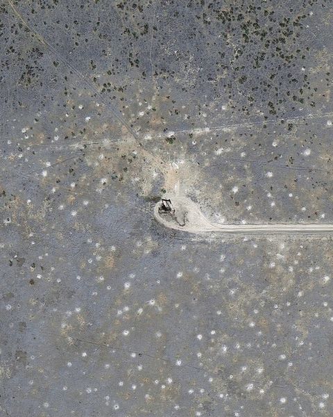 Editor: This is Mishka Henner's "API 21930915 San Andres, TX," a 2012 photograph. I'm struck by the strong diagonal lines; it's almost dizzying! And then there's that stark industrial element breaking the pattern. How do you interpret this work from a formalist perspective? Curator: Note how the parallel lines, alternately dark and light brown, establish a powerful rhythm. Consider how that rhythm is then disrupted by the off-center placement of the oil pump, almost as an after thought. How does the artist use colour? Editor: Well, the limited palette, earthy tones of brown, tan, and a little grey makes it quite striking, not very dynamic. The colours seems monotonous, until that singular construction introduces complexity and form. Curator: Precisely. The texture, or the illusion thereof, becomes crucial. The image presents the surface as being etched. From this, it becomes about planes in the earth, with the oil pump breaking the pictorial logic. Now think about semiotics – what signs are present and what do they suggest in our culture? Editor: The strong geometric linearity implies control, and perhaps imposed order on nature; the mechanical structure suggests that progress and industry undermine the serenity and impose form on function. Curator: Yes, it's about dissecting the visual relationships within the image itself, independent of any narrative context. The lines function as pure form, their repetition creating a visual tension with the singular structure. Does our reading require something about where it exists? Editor: Not at all! It's fascinating to see how a purely formal reading reveals such a complexity of meanings simply through line, shape, and composition! It shifts focus away from the immediate topic of environmental awareness into that of formal consideration and pictorial deconstruction. Curator: Exactly. By prioritizing the formal elements, the artwork creates a framework for deconstruction and alternative readings, which are valid within its visual form.