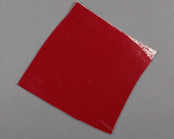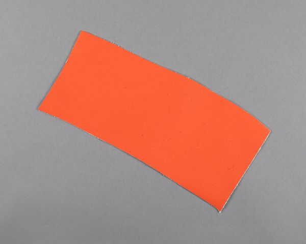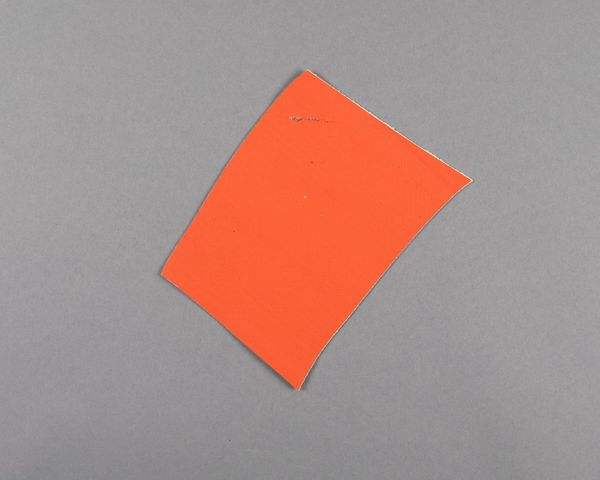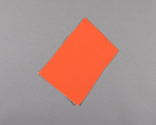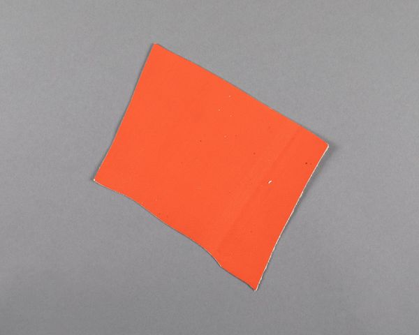 Curator: Here we have a "Painted Canvas Fragment" by Barnett Newman. Editor: Whoa, intense! It feels like staring into a sunset that's about to swallow you whole. Curator: Note how the composition is divided, yet the orange and red interact dynamically. Consider, too, the artist's preoccupation with color field painting and its profound impact. Editor: It's just a scrap of canvas but has so much power, so much energy, crammed into it. It almost vibrates. The diagonal division, the stark color contrast—it’s practically screaming for attention. Curator: Perhaps. Though, it's more like the colors resonate rather than scream, inviting viewers to explore a liminal space between visibility and invisibility, the finite and infinite. Editor: Well, I guess we all see our own thing in it. Curator: Precisely. That, perhaps, is Newman's intention. Editor: Food for thought, right there.
