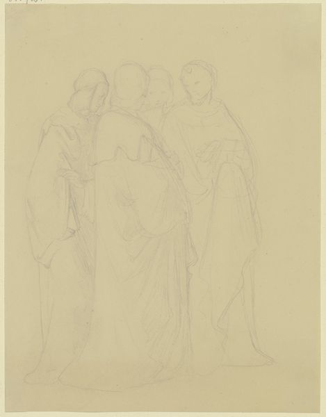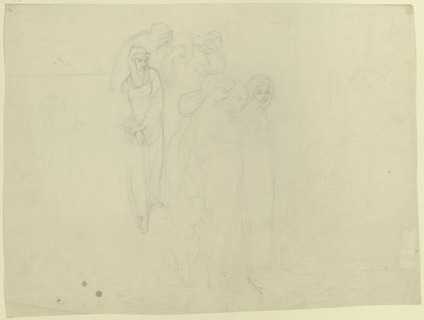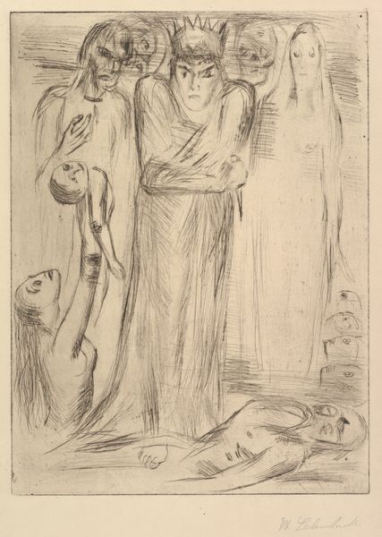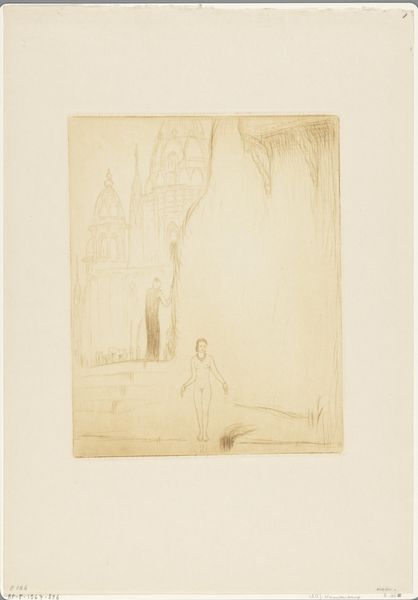Editor: Here we have Wijnand Otto Jan Nieuwenkamp's "Bathing Girls on the Banks of the Ganges in Benares," possibly from 1917. The subdued tones and sketchy lines give it an unfinished feel, almost like a memory. What strikes you most about this work? Curator: I immediately focus on the "handprinted image" as it is referred to in its metadata. The technique of etching and possible tea-staining on toned paper points towards an important tension, one that blurs the lines between fine art and the everyday practices of craft. Nieuwenkamp chose to highlight the *process* itself. Do you see any potential meaning arising from this emphasis on process? Editor: I guess focusing on process over pristine product shifts our attention to the labor involved, maybe challenging the romantic idea of the lone artist effortlessly creating beauty? Curator: Precisely! Consider also the social context. Nieuwenkamp, a Western artist, depicts a scene in Benares. The material choices – etching, staining – carry a colonial weight. It wasn't mass produced through industrial printing. What does the deliberate choice of these ‘hand’ methods convey to you? Is it romanticizing “exoticism”, or engaging in a material critique? Editor: It's complex. Maybe the hand-printing suggests a slower, more intimate engagement with the subject, attempting to counter the speed and detachment often associated with colonialism? But could it also be a form of appropriation, where he's borrowing from another culture to elevate his own art? Curator: Exactly. Think about the availability and distribution of the art work too. Limited numbers due to the time constraints around printing equals higher worth on a commodified art market. His labor becomes part of the final artwork’s cost, making it inaccessible. What I find interesting here, however, is that he makes this colonial dynamic more visible, more tangible through the very *stuff* of his art. Editor: That makes me look at it in a new light. I was so focused on the image itself, but you're right, the materials and process are just as important, especially when considering its historical context. Curator: Absolutely, and hopefully, we also realize our subjective perspective toward artistic productions.