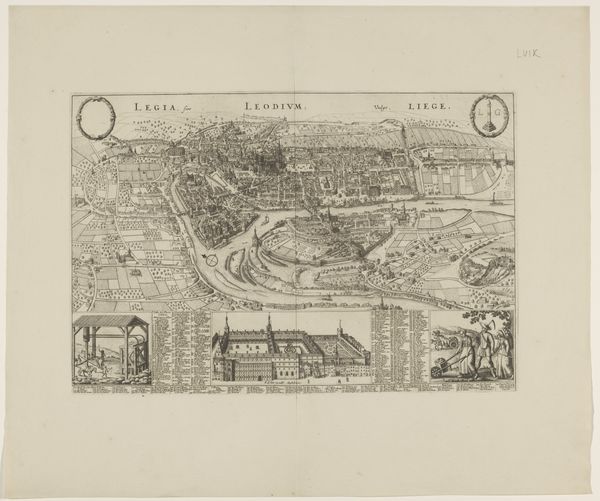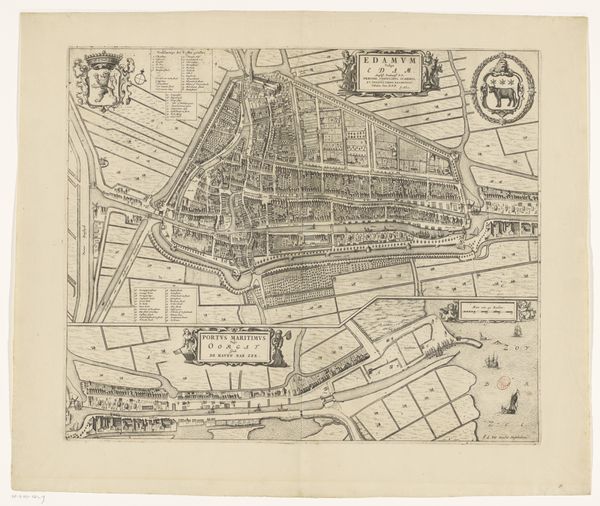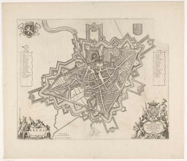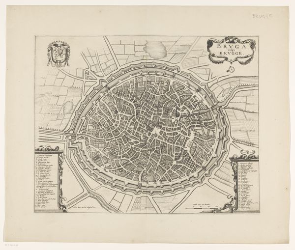 This is Frans Hogenberg's "Plattegrond van de stad Utrecht" from around 1570-1590, a detailed engraving offering a bird's-eye view of the city. The artwork presents a structured vision, where each building and street is meticulously rendered, creating a dense tapestry of urban life. Look at how Hogenberg uses line and form to create a sense of depth and order. The city is encircled by defensive walls, emphasizing its structured and fortified nature. Open spaces and fields outside the city walls provide a stark contrast to the urban density within. The print blends cartographic precision with artistic expression. As the early modern period witnessed the rise of print culture, Hogenberg’s detailed work embodies the era’s emphasis on knowledge, observation, and the visual representation of space. It invites us to consider how the period's inhabitants perceived and represented their world. Consider how this map functions both as a practical tool and a symbol of power, reflecting the period's changing relationship between knowledge, space, and representation.