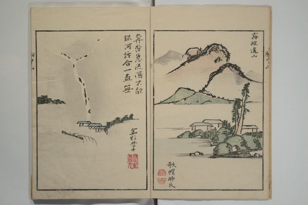 Editor: This is Tani Bunchō's "Illustrations of Japan's Famous Mountains," from the early 19th century. It’s a book, opened to a two-page spread. The starkness of the ink gives the mountains a powerful presence. What do you see in this piece? Curator: Well, these illustrations were created during a time of growing national consciousness in Japan. Bunchō, working within the confines of the Tokugawa shogunate, likely sought to visually map and celebrate the Japanese landscape, thus reinforcing a sense of national identity through depictions of specific, iconic mountains. Editor: So, the political climate influenced the subject matter? Curator: Precisely. The act of documenting these landscapes also highlights the social role of art. How might the accessibility of a printed book, compared to a singular painting, affect its reception and impact? Editor: I hadn't considered the wider distribution. I guess this book helped people connect with their country. Curator: Exactly. It gives us a window into the art's intended purpose.