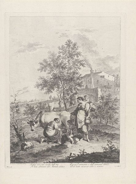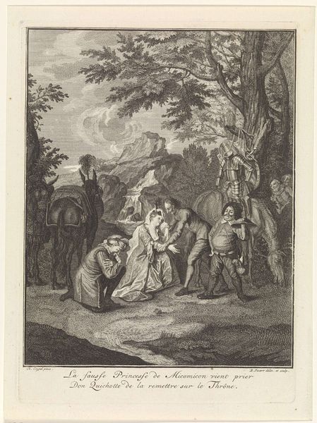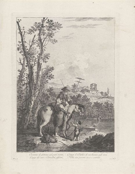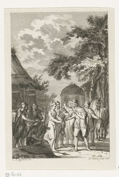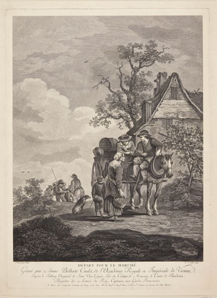 Curator: The emphasis here is on the printmaking process itself. Look at the layering of lines, the labor involved in creating this illusion of depth and texture. How does Coulet's work as a printmaker influence our understanding of the marketplace as a site of labor and exchange? Editor: This print, "Departure for the Market" by Anne Philiberte Coulet, it seems like a document of everyday life. But looking closely, I am curious about all the activity depicted. What do you see in this piece? Curator: We often overlook the materiality of prints, how they democratized images. This print shows a journey to the market but also serves as a journey into the techniques and social implications of printmaking in the 18th century. Editor: That makes me think about who had access to these images and how that shaped their world. Thanks for highlighting those details!
