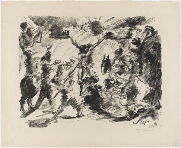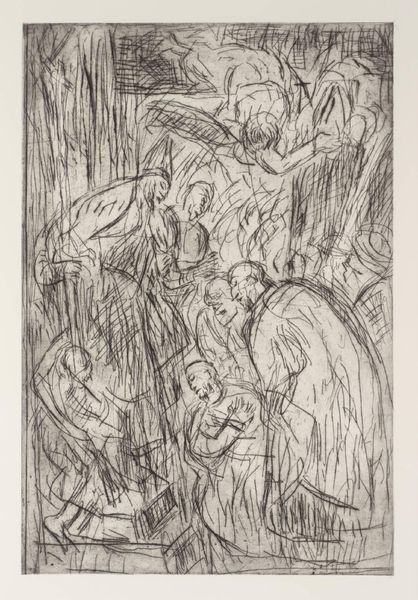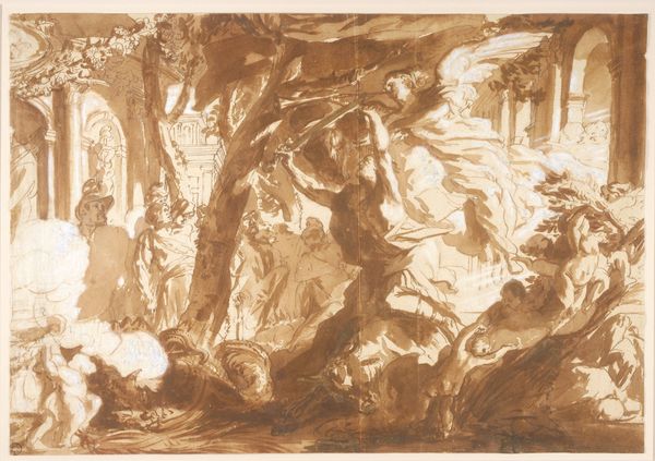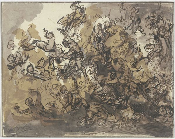Curator: Here we have Francisco Goya's "Religious Procession, Study for 'Los Disparates'", a preparatory drawing for his series of etchings. Editor: Immediately, I'm struck by its swirling, almost chaotic energy. It feels like a dream, or perhaps a nightmare, rendered in sepia tones. Curator: The monochromatic treatment is indeed striking. Goya likely used a wash technique, layering diluted ink to build up tones and textures. This drawing provided a blueprint, informing the subsequent etched print. Editor: The medium definitely lends itself to that sense of unease. Look at how the figures seem to melt into one another, obscuring any individual identity. What does it tell us about Goya’s views on these public displays of faith? Curator: Given Goya's social commentary throughout "Los Disparates", it's probable that he was critiquing the performative aspects and perhaps the irrationality he perceived in such processions. The materiality of the drawing itself becomes a record of that critique. Editor: It makes me wonder what Goya was truly trying to process through the making of this piece. Curator: Indeed, by examining the means of production, we gain insight into Goya's process and perspective. Editor: It seems Goya was exploring the depths of human nature itself.