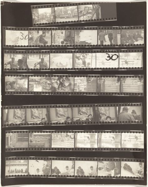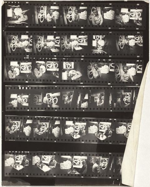 Editor: This is Robert Frank’s "Painters no number", a gelatin silver print from the 1950s. It's essentially a series of contact sheets showing a painter in their studio. I'm immediately drawn to the artist at work, surrounded by his paintings and all the markers of an artistic milieu. How does this photograph speak to the social context of art creation during that period? Curator: This image offers a glimpse into the daily life of an artist, far from the romanticized ideal of the solitary genius. By presenting it as a contact sheet, Frank unveils the working process, the trial and error inherent in artmaking. Consider the social landscape of the 1950s; artistic circles were often tightly knit, with their own hierarchies and power dynamics. Frank, as an outsider in many ways, captures the artist in their raw, unglamorous reality. Do you notice how the frame includes the photograph’s own material evidence? Editor: That’s fascinating, yes. I see it too. It feels very authentic, almost like a behind-the-scenes look. The way it includes the markings on the film is almost like an anti-art statement. Does this piece suggest anything about Frank’s commentary on art institutions, or his intention by capturing painters in what seems to be intimate and unrehearsed settings? Curator: Precisely. Frank often positioned himself outside mainstream artistic circles, acting as a social observer. "Painters no number," presented unconventionally as a contact sheet, perhaps critiques the formalistic tendencies of art institutions, favoring instead an unfiltered perspective of artistic labor. These were the years just preceding the huge popularity of Pop Art; does this influence the image’s social critique in any way? Editor: It does recontextualize this image when viewed against the rise of Pop Art. So, instead of elevating a single polished artwork, Frank gives us an unfiltered view into the process and the somewhat less celebrated environment of the artist. It feels less precious somehow. I appreciate learning that. Curator: Indeed. Frank’s photograph becomes a valuable document, revealing not just an image of an artist, but also the social conditions that shaped their creative production, and how even presentation impacts artistic consumption.