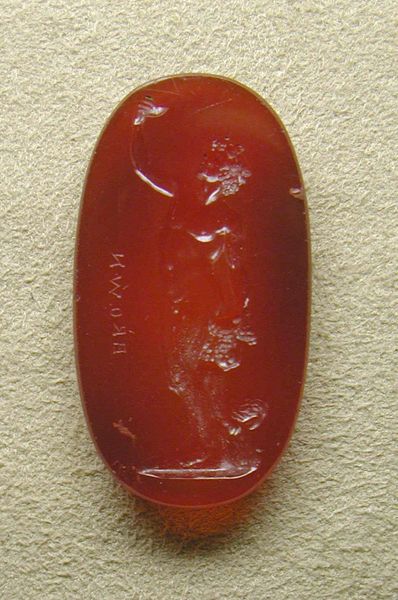 Curator: Here we have a Roman carnelian ring stone dating from the late 2nd century, now housed at the Metropolitan Museum of Art. It's attributed to the artist Aspasios. Editor: The stone glows with a deep, internal fire. I’m struck by the intimacy of it – so small, yet so intensely detailed. You can almost feel the labor that went into carving that portrait. Curator: Absolutely. And portraiture was such an important tool in the Roman Empire. Not only as markers of individual status, but as statements of belonging and power within Roman society. Think about the hands that touched this. Editor: That brings it to life. Carnelian itself carries so much weight—its association with protection and courage. This wasn’t just a pretty bauble; the choice of material signals deeper social intentions. Was carnelian easily available, or a rare imported gem at that period? This has strong implications for value and audience. Curator: The reddish hue no doubt contributed to that symbolism and implied power. But let's look at Aspasios, the artist—presumably a known name, trusted to portray likeness and project authority. Someone specific commissioned and wore it, so understanding the patron is as important as analyzing the craftsmanship. Editor: I see the slight imperfection on the top, evidence of use or damage, so each stone likely presents different working constraints. You begin with the raw material, and carve away using miniature tools that would wear down very fast, adjusting the design to suit the original contours, densities, and so forth. The person doing this knew the materials really well. Curator: Fascinating to consider the creative act against a background of power dynamics and individual agency. It reminds us that this wasn't just artistic production. Editor: I agree, and this little stone reminds us how intensely Roman life centered around image, object, and belief, with the role of material and labor as a testament to social values.