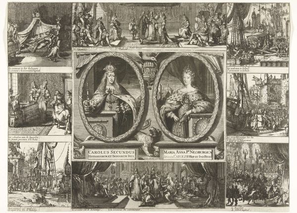Curator: Greetings. Today we examine Crispijn van de Passe the Younger's "Allegorie op de verovering van 's-Hertogenbosch door Frederik Hendrik, 1629," an engraving, etching and print residing in the esteemed Rijksmuseum collection. Editor: Thank you. The intricate lines and the sheer amount of detail in this print are striking! It almost feels like a carefully constructed stage play. How do you interpret the work’s composition, looking purely at its form? Curator: Note how van de Passe deploys the triptych format, creating a visual hierarchy. Observe how the central panel frames the figures of authority within an archway garlanded with symbolic elements. Do you perceive a calculated balance in the arrangement of portraits on either side? Editor: I see the portraits flanking the central scene, which are neatly organized in rows, providing a sense of order. Is the symmetry important to understanding the meaning? Curator: Precisely. The formal symmetry reinforces the political order of the Dutch Republic. Further, note the stark contrast in textures achieved through line variations. Can you see the strategic employment of light and shadow to sculpt depth within a monochrome palette? The figures, emblems and portraits form distinct structural zones that create a visual discourse between power, place and personages. How might the arrangement of the spheres and map add to this dynamic? Editor: It does seem intentional, especially with the spheres placed so carefully, flanking the map like sentinels! So, without digging too deep into its historical meaning, we can still read this image through its deliberate arrangement of shapes and textures alone. Curator: Correct. Consider that the intrinsic visual language provides a vital mode of understanding, independent of historical context. Close analysis allows for deconstruction of visual order as a form of rhetorical declaration. The beauty of art is appreciating structure! Editor: That’s so helpful, I am more enlightened appreciating its composition today, rather than focusing on the details I may not fully understand!