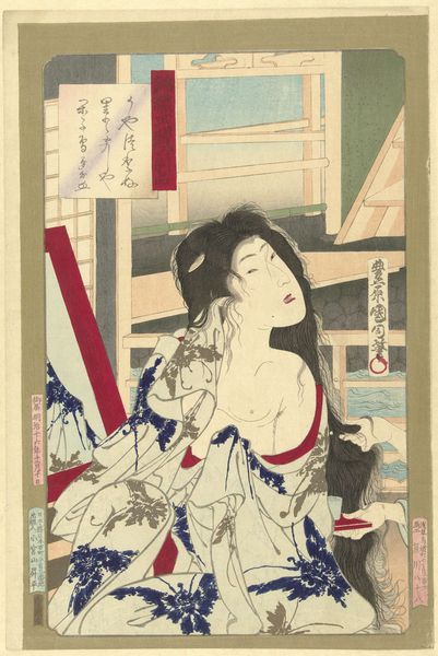 Curator: We're looking at "Vrouw een kimono opbergend," which translates to "Woman Storing a Kimono," by Utagawa Kunisada, dating from around 1836 to 1838. It's currently housed in the Rijksmuseum. Editor: The colors strike me immediately – that soft blue patterned kimono, almost overwhelming the figure. It creates a domestic yet slightly melancholic mood. Curator: Notice how Kunisada employs linear perspective, not for strict realism, but to structure the space, guiding the viewer's eye from the woman to the receding shelves. The composition uses flattening, the signature of Ukiyo-e prints of this time. Editor: I see that, but what I find fascinating is the suggestion of interiority. The act of storing the kimono suggests a pause, a moment of reflection in the life of a woman during the Edo period. Who is she? Is she simply fulfilling a role? Or is there a hidden narrative of power within her constrained existence? Curator: Well, the design motifs are definitely deliberate. The patterns, the layering of textures - these aren't random. The artist creates a dialogue between the geometry of the architecture and the fluid motifs of the garment. The contrast of the swallows evokes freedom against constraint. Editor: And look how the artist captures the details. I agree. But these beautiful robes and the presentation are also visual cues for the viewer on social rank, decorum and position, creating both symbolic narrative as well as beautiful visuals to unpack ideas of historical identity and class. Curator: The choice of woodblock printing itself offers us so much insight. The distinct lines, the deliberate registration of colors; all of this contributes to the print’s dynamic and enduring aesthetic power. The flatness emphasizes line over mass, further simplifying and stylizing the subject. Editor: Ultimately, Kunisada prompts us to contemplate women's roles through cultural conventions, gender, class, and the subtleties within societal limitations. Curator: Absolutely, and through that careful balance of line, form and pattern, he crafts a work that is as engaging aesthetically as it is intellectually stimulating. Editor: I appreciate how this piece challenges us to bridge past aesthetics with ongoing societal concerns and understanding.