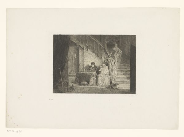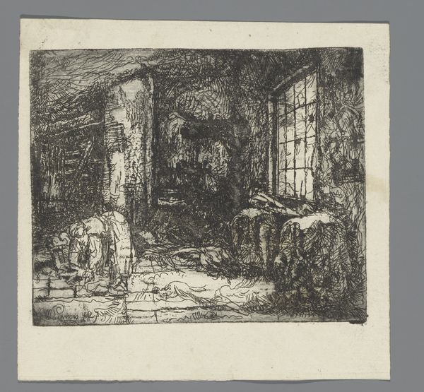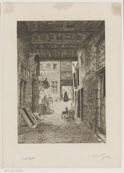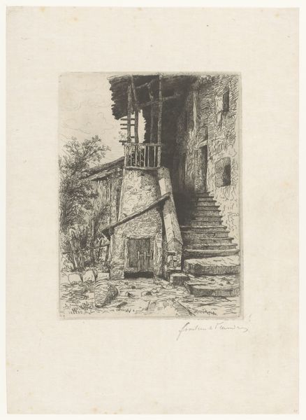 Editor: So, this is "Beggar at the Door of a Farmhouse," an etching by Frans Van Kuyck, made sometime between 1862 and 1911. It's a very detailed scene, and honestly, quite somber. What strikes you when you look at this print? Curator: I notice immediately the emphasis on the dwelling and its materiality. Consider the thatched roof, the rough-hewn stones, the tools leaning against the wall – each element speaks to the labour required to construct and maintain this meager existence. Look at the layers and techniques. What paper did they use and how does the color change the impression? How does the plate show signs of wear? Editor: It definitely feels like the artist wants us to focus on that labor, the reality of daily life for these people. Curator: Precisely. Etchings, like this one, were often reproduced, allowing wider distribution of such images. Think about who consumed these prints and why? Did it influence social reform? This brings forward questions about class and power structures, doesn’t it? How does that oversized kettle impact our reading? Editor: It does make you think about how little the beggar probably has compared to the residents inside, despite their humble home. It feels critical. Curator: The print medium itself reinforces that critical lens, enabling wider access to images of social inequality, but also generating income through the market. How does it all coalesce? Editor: I hadn't thought about it that way, the print being both a commentary on poverty and a commodity. Thank you, that has changed my understanding of the work. Curator: Indeed. The material reality of art is so very important. And how that reality can shift how a piece is interpreted, as well as how it functions within society.