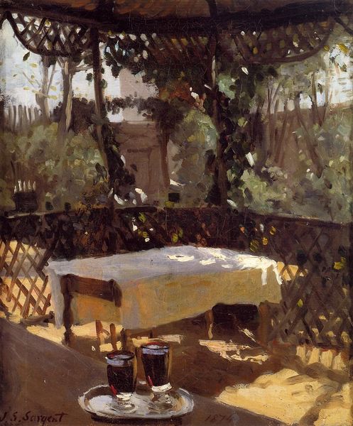 Henri Martin painted 'Terrace of the Manor in Marquayrol' using the pointillist technique he adopted in the 1890s. Martin was deeply influenced by the symbolist movement which rejected realism in favor of subjective and spiritual experiences. This piece captures a quiet, intimate corner, likely at the Manor where Martin lived. The terrace is set for tea, with dappled sunlight filtering through the leaves. The scene evokes a sense of leisurely domesticity, reflective of the privileged lifestyle afforded to successful artists of the time. The very act of painting such scenes was a statement in itself, celebrating bourgeois comfort. However, the scene remains devoid of people. What narratives are absent here? While seemingly a benign domestic scene, consider how gender roles and class structures were implicitly reinforced through the depiction of such spaces. It invites reflection on who is allowed to occupy and enjoy these idyllic settings. Ultimately, the beauty and tranquility of Martin's terrace prompts us to consider the complex interplay between personal experience, social status, and artistic expression.