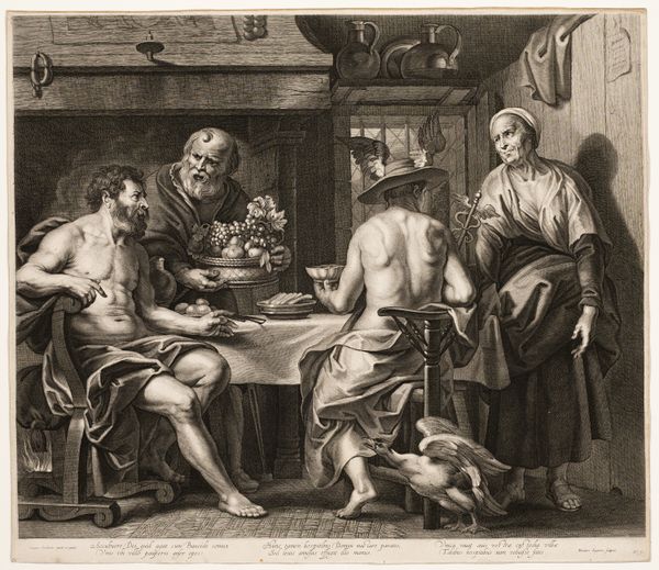 Curator: Looking at this canvas by Palma il Giovane, created around 1600, you immediately get a sense of theatricality. The scene appears dramatically lit, almost stage-like. Editor: It strikes me as a morality play unfolding right before our eyes. I can almost feel the intoxicating pull of earthly pleasures emanating from the canvas. Curator: Absolutely. The painting is titled "Amusements of the Prodigal Son", a story popularized by the Bible. Consider how it might reflect anxieties in Venice during the artist's life? After the Council of Trent, art began to express the morals. This Baroque style, it’s also clearly trying to get to one's emotions, wouldn't you agree? Editor: Indeed. And il Giovane really lays it on thick, doesn’t he? Every object tells a story, or maybe, is more about wealth than an intended biblical parable. Consider the way Palma il Giovane frames the son with the wine bearer and the plates—very luxurious and expensive—that reinforces not just his lavish, yet ultimately fleeting lifestyle, but one about social currency and power, too. Curator: He clearly draws inspiration from earlier Venetian masters like Veronese, but introduces a distinct intensity. There are art critics who might compare him with Caravaggio... I can feel your disapproval brewing, and understand how the treatment of subject contrasts might strike an Iconographer as jarring. Editor: To me it represents, above all, vanity and temporality. The prodigal son's stupor almost suggests spiritual emptiness; or at least he is physically overwhelmed, as if it is an impending symbol for ruin. He becomes so immersed, he neglects his true values for superficial and hedonistic things. I interpret this work almost like a Memento Mori. Curator: Which leads to this being installed and held by Galleria dell'Accademia of Venice. It's hard to say if it had the exact effect il Giovane wished, considering its function in the present is mostly to signal an antiquated set of ideals from religious doctrines. Editor: Palma’s message is timeless. Its message still relevant and thought provoking regardless of any religious affiliation one may have or not.