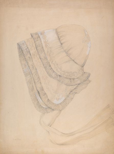 Sarah F. Williams created this watercolor painting of a "Lady's Night Cap." Born in 1855, the cap is likely reflective of Williams's own lived experience and domestic life during a time when women's roles were largely confined to the home. Her cap embodies the complex intersection of gender, domesticity, and identity. Nightcaps like these were worn by women as a symbol of modesty and respectability, marking a clear boundary between the private and public spheres. Notice the intricate details of the cap's design, which provide a glimpse into the artistry and skill associated with traditional women’s work. The delicate lacework speaks to the time and effort invested in creating an object of both beauty and utility, reflecting the emotional investment and care that went into these handmade items. The artist invites us to reflect on the historical and cultural contexts that shaped women's lives.