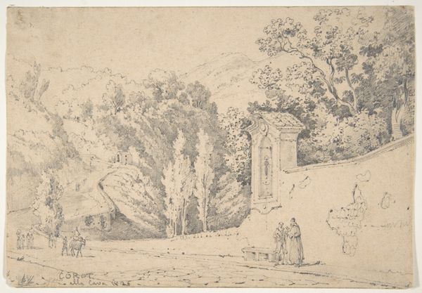 Adolf Hoeffler created this pencil drawing of Tivoli, a landscape near Rome. The sketch brings to mind the historical and cultural context of the Grand Tour, a tradition since the 17th century. The Grand Tour was a rite of passage for wealthy Europeans, particularly young men, who traveled through the continent, with Italy as a highlight. Hoeffler, born in the mid-1820s, would have grown up in a society where travel and exploration were romanticized. The drawing represents the artist's own experience of place, but also speaks to broader themes of class, privilege, and the gaze of the colonizer. We see this in the depiction of the lone figure on horseback, a symbol of dominance moving through the landscape. This artwork invites us to consider the power dynamics inherent in travel and representation, while pondering the legacy of the Grand Tour and its impact on shaping cultural perceptions of foreign lands.
