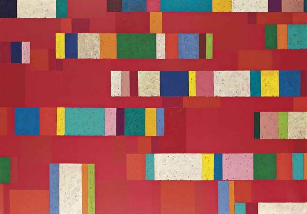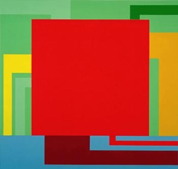 Curator: Before us we have Peter Halley’s, “Cartoon Network”, an acrylic-paint on canvas work created in 1997. Editor: It's surprisingly cheerful, isn't it? Despite the rigid geometry. The colors pop, reminding me of retro graphic design, maybe early computer interfaces. Curator: The title’s reference is key. Consider how popular media—and its means of mass distribution—affects contemporary notions of spatial relations. Halley appropriates the visual language of networks, reducing them to basic shapes and bold colors. The "cells" and "conduits" mimic an abstracted circuit board. Editor: And speaking of color, that lavender square seems to want to flatten out and become a textile... or commercial packaging! I think the choice of industrial acrylic and a large canvas further links this to production and commodity culture of the time. Curator: Exactly. Halley positions us to reconsider how social structures are built on a visual grid of technology. How those systems dictate how we consume our world via commodification. Editor: This work could very easily appear as mere colorful shapes. I find the relationship between Halley's theory-influenced vision and what an average viewer internalizes rather interesting, no? Is this just formal experimentation? Decoration? Or pointed socio-political commentary cleverly disguised? Curator: Well, in art historical discourse, there's always going to be some debate over his position and reception within museums and galleries; yet, the painting definitely operates in a symbolic field, prompting critical thought regarding late 20th-century anxieties about information control and spatial confinement. Editor: I agree that the interplay between its surface appeal and underlying implications keeps me engaged and wanting to discuss those historical and material contexts further. Curator: Definitely food for thought, inviting further contemplation long after we've left it.