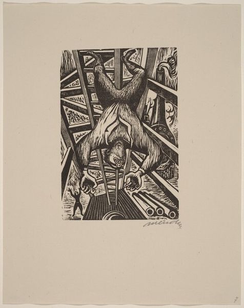 Editor: So this is "Couple with Cat in the Jungle," a 1920 woodcut by Josef Eberz. It feels…claustrophobic, almost aggressively so, with the density of the jungle pressing in around the figures. What leaps out at you when you look at this work? Curator: Claustrophobic is a great word! I feel it too. Look how Eberz has wrestled the natural world, especially that foliage, into almost brutal, angular shapes. The whole image breathes Expressionism. What's remarkable, though, is how these rigid forms still hint at a vulnerable intimacy, don't you think? I see it in the couple's stylized poses – a certain tenseness, mirrored perhaps by the alert cat. Are they comfortable or trapped in paradise, I wonder? Editor: Trapped in paradise! I like that. It's not exactly the Gauguin ideal of Tahiti. There’s this starkness to the figures, especially their faces...almost mask-like. Curator: Exactly! That stylized element pushes us away a bit. Think about what Expressionism was doing at this time. It wasn’t just about depicting a scene, it was about rendering an interior emotional landscape. Eberz seems to be probing at something deeper. Perhaps about how relationships can be both a refuge and a cage, where primal instincts are close to the surface. Notice how he contrasts dark, almost gothic-like blocks of ink with smaller and repeated areas. Why? Editor: Maybe that tension is exactly the point. It’s not a simple celebration of nature, but something much more…complicated? Curator: Complicated, conflicted…human. It’s easy to get lost in the starkness of the technique but when you sit with the work you begin to intuit the rich ambiguity inherent in the relationships that we crave. I suppose I see that cat sitting in me. Editor: That tension definitely makes it more thought-provoking, for sure. It's been helpful to delve into the feeling and expression here versus getting caught up in just the scenery itself. Curator: Precisely, sometimes beauty lies beneath a scratch or two, eh? I leave seeing relationships quite differently today!