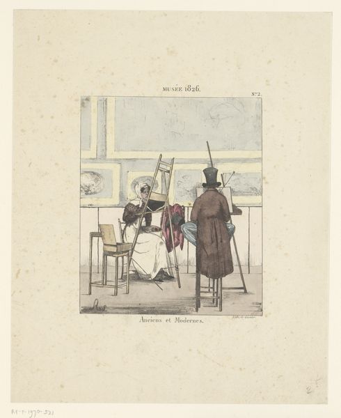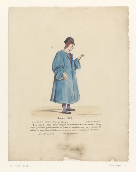 Editor: So this is "Kostuum van Lodewijk XI van Frankrijk uit het drama Louis XI à Péronne," a watercolor by Louis Boulanger, from 1826, currently residing in the Rijksmuseum. It has a somewhat fairytale feel, because it has a very specific, theatrical quality that is typical of costume design, as you can see with the subject. What do you notice about this particular artwork? Curator: Formally speaking, the composition is rather striking. Boulanger focuses intensely on the interplay of colors and textures within the costume itself. Note the juxtaposition of the deep purple velvet with the brighter green fabric. How does that contrast strike you? Editor: The choice of colors and texture does provide a vibrant visual interest, especially with the white stockings and their stark contrast. Why focus on costume? Curator: Consider the use of line, shape and colour here: notice the sinuous curves of the cloak, the geometric patterns of the stand nearby, and the flatness of the picture. Taken together, how would you describe the artist's attitude towards surface and depth? Editor: You are right. All are displayed with great precision but without attempting much in the way of realism; he highlights specific textures and forms, drawing attention to each element while simultaneously maintaining its distinct two-dimensionality. That suggests more focus on how surface contributes to conveying a greater narrative? Curator: Precisely. Editor: I learned that analyzing formal components unlocks symbolic meanings, allowing the viewer to access the artist's goal in portraying narrative meaning through aesthetic decisions. Curator: Indeed. Form serves to heighten the viewer's engagement with narrative and symbol through attention to how design communicates meaning.
