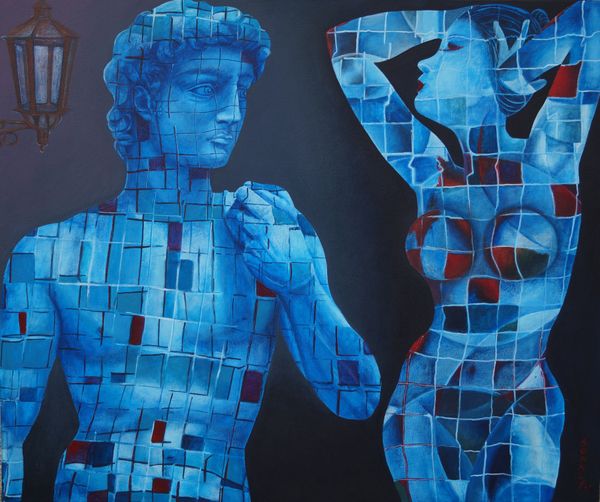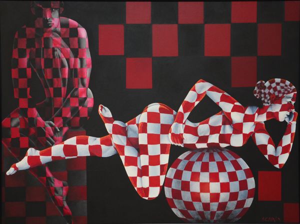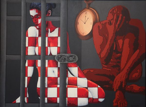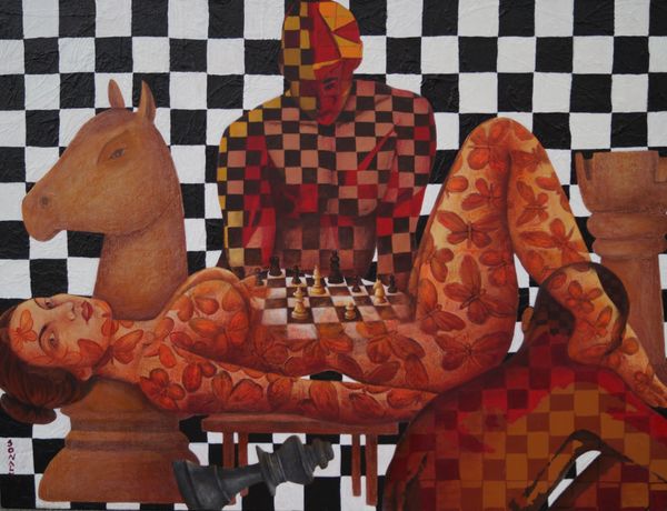 Here, Sonaly Gandhi presents us with a tableau of figures and forms steeped in symbolism. The checkered pattern, a dominant motif, evokes the duality of human existence. This duality is reminiscent of the classical world’s theatrical masks, one side showing joy, the other sorrow, reflecting the contrasting experiences of life. Here, the artist uses this pattern to signify the multifaceted nature of identity, a theme that has echoed through art history from ancient mosaics to contemporary conceptual works. In the context of this painting, the pattern could symbolize the complex interplay between concealment and revelation, hinting at hidden emotions beneath the surface. Note how the figures are seated near a car; this is a symbol of motion, change, and the journey through life. As we journey through life, we move between different states of being. Gandhi’s arrangement, fraught with emotional tension, engages viewers on a subconscious level. The symbols here remind us of our journey through life, ever changing in meaning.