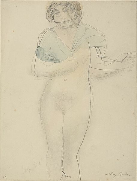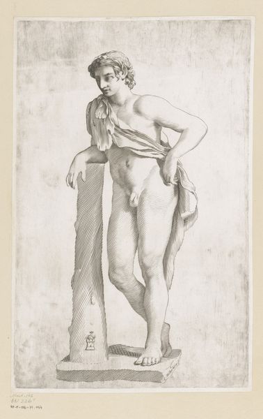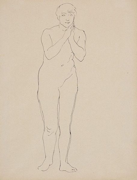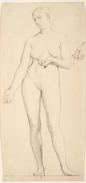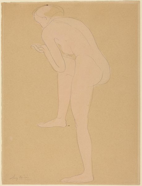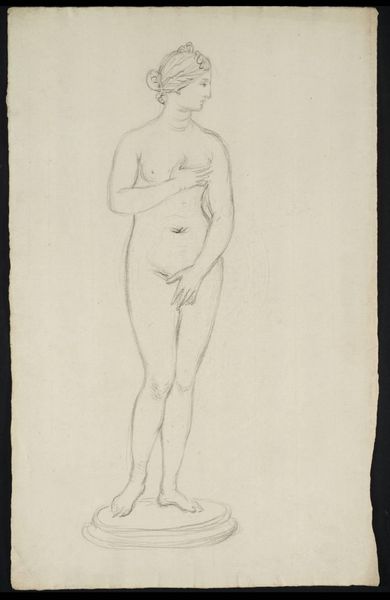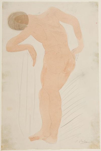 Curator: Here in Gallery 23, we see a 1904 pencil drawing, a reproduction of a work by Auguste Rodin. It's currently part of the Rijksmuseum's collection. Editor: There's an almost haunting quality to the piece. It’s ghostly in its lightness, a fleeting glimpse captured in pencil. Curator: It's interesting you say that. Rodin often explored movement and fleeting moments in his sculptures. This drawing perhaps captures a similar essence on paper. One wonders how such work fits into the evolving notions of public art at the turn of the century. Were sketches of nude figures meant for private studios or acceptable for wider audiences? Editor: Well, nudity has long been a symbolic language. Even the suggestion of drapery hints at covering and revelation. The pose, relaxed yet slightly withdrawn, feels like Venus emerging, reborn. Are we to think of the artist reclaiming a very old signifier to create fresh emotional associations? Curator: Precisely. Rodin was operating in a time when traditional artistic academies still held significant power, even as new art movements were forming. How artists negotiated these complex institutions really impacted their acceptance and career trajectories. Rodin did challenge that, of course. Editor: And he does so again and again with figures caught in poses, revealing movement and interiority. Rodin offers the viewer an unidealized beauty. Curator: It is thought provoking to consider the political dimension of artistic expression during the era of the Third Republic. Was art being viewed and discussed differently by certain social and political classes? It certainly was. Editor: Absolutely. This particular piece whispers more than shouts, though. There is this intimate immediacy to it, suggesting, perhaps, the complexities beneath appearances that are shared over time and transcend specific historical eras. Curator: So many layers to unpack. Thank you. Editor: Thank you.