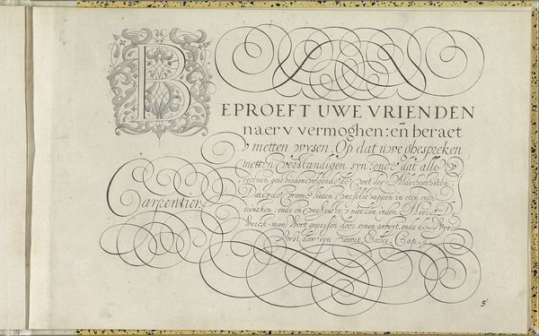 This calligraphic work, *Titel van de Festa della Sensa*, was created by Jost Amman in the late 16th century. The dense black lettering against the off-white paper immediately strikes us with its rhythmic and decorative intensity. The bold, angular letterforms are intertwined with delicate flourishes, creating a visual dance between structure and ornamentation. This piece exemplifies the intersection of form and function. Amman's choice of black ink emphasizes the visual weight of the text, drawing our eyes into the intricate details of each character. The composition follows a structured layout, yet the calligraphic style introduces an element of fluidity and expressiveness. The work functions as both a textual document and a visual artifact, inviting us to contemplate the relationship between language and aesthetics. It destabilizes the notion of fixed meaning by presenting text as a dynamic, evolving form. This challenges the static conventions of typography.