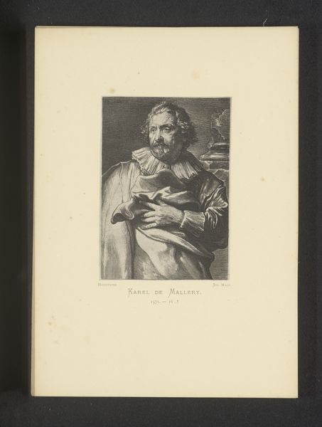 Curator: So, here we have an engraving from 1767. Antoine de Marcenay de Ghuy made this portrait of Henri de Latour d'Auvergne, the Vicomte de Turenne. Editor: My first thought? Melancholy! Even the framing—the greenery creeping around a low wall—feels a bit like mourning. The stark contrasts of light and shadow give the man such gravity. Curator: Well, remember that engravings, unlike painting, are about reproduction and accessibility. De Ghuy would have considered his audience and what sort of imagery conveyed status, power and, of course, commemorated Turenne's legacy. Editor: You’re right. But even understanding that it's a calculated representation doesn’t diminish the feeling. There's something so human about the softness in his eyes, offset against the cold steel of his armour. Did armour symbolize strength, or oppression for you? It is like holding those two things together. Curator: Indeed, there’s tension. The piece highlights the transition from the Baroque, all dramatic flair and aristocratic symbolism, to something hinting at the Enlightenment ideals of honoring great men. The text itself—"It makes honor to man”—speaks to this. Editor: And the landscape lurking in the background, that ghostly hint of nature... almost mocking the very notion of human achievement. That makes it seem very real for me, because you’ve always had a complicated relationship between humans and nature, haven't you? It makes him mortal somehow, against that grand backdrop. Curator: Exactly. These choices serve a purpose; by crafting him amidst this landscape and hinting at mortality, de Ghuy elevates Turenne's story to one beyond simple military victory. Editor: You’ve framed how material and message are intertwined in ways that amplify emotional nuance. It does make this piece much more poignant for me. Thanks! Curator: The nuances are always revealed in careful consideration of their interplay. I leave this engraving more enriched for the perspectives that were raised.