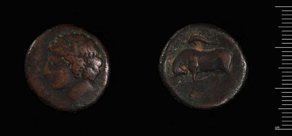 Editor: This is a coin minted by Agathokles of Syracuse. It's incredible to think that something so small could have had such a large impact on history! What can you tell me about its significance? Curator: It's a powerful symbol, isn't it? This coin wasn’t just currency; it was propaganda. Agathokles, a self-proclaimed tyrant, used these images to legitimize his rule and project power. What do you notice about the imagery? Editor: One side shows a figure's head, maybe a ruler, and the other has a chariot. Curator: Exactly! The portrait likely represents Agathokles himself, linking him to divine authority. The chariot? A symbol of military might and victory. Coins like these are fascinating because they show how rulers used art to shape public perception and maintain their grip on power. Editor: So, it's less about the economic value, and more about the political statement? Curator: Precisely! It reveals the complex relationship between art, power, and the public in ancient Syracuse. Editor: I never thought of coins as political art before. Thanks!