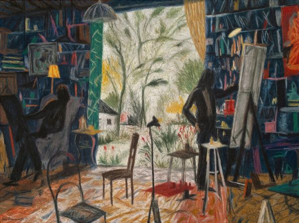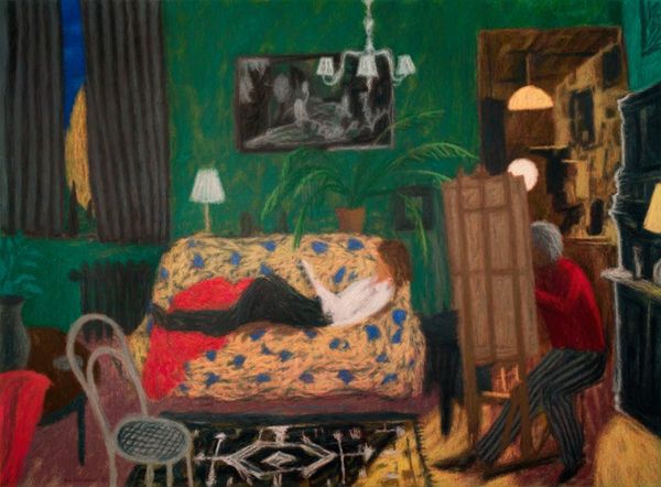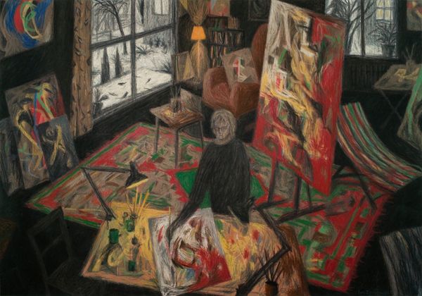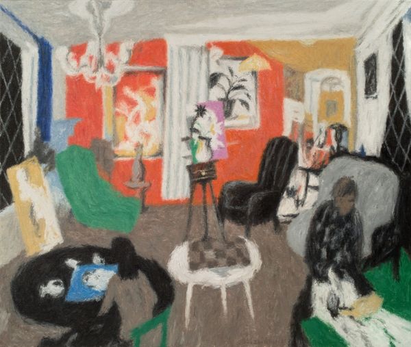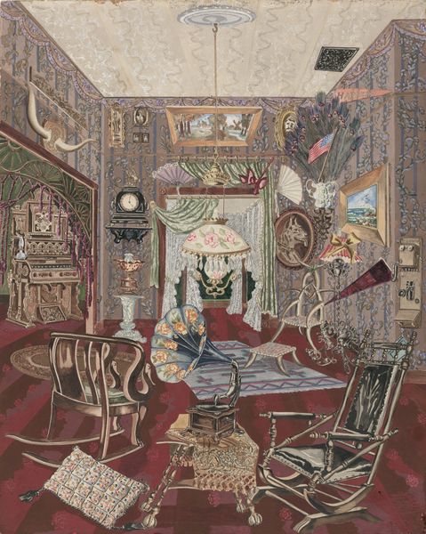 Editor: We are looking at "Aunt’s Salon" by Iwo Zaniewski, an undated oil painting that’s wonderfully… cozy. The brushstrokes are visible, giving it an almost fuzzy texture. The warm tones, like the red cabinet, contrasted with cool hues, like the lavender chair, evoke a comforting, domestic mood, wouldn’t you say? What initially stands out to you? Curator: Cozy is the perfect word. It’s like stepping into a memory, isn’t it? What gets me are the layers, not just of paint, but of time, of lived experience. The portraits peering from the walls, the seemingly random collection of objects – they whisper stories. Imagine spending hours in this room, just breathing it all in. Do you think the artist is celebrating or perhaps slightly poking fun at the bourgeoisie's interior fetish? Editor: I see what you mean. The somewhat distorted perspective could definitely be a commentary. What about the painting within the painting? The one being created by the person in the easy chair, looking at what's in front of them? Does that hint at anything deeper, any idea of 'art imitating art?' Curator: Aha! The art within art…a Möbius strip of creativity! It suggests a self-aware loop. Zaniewski paints the painted. Think of the artist questioning his own vision. Or perhaps suggesting art can't perfectly represent real life: it merely offers its version, influenced by the artists own world. How meta, right? Is that artist *truly* in Auntie's salon, or in a dreamscape conjured in paint? Editor: Wow, that makes you wonder…it's more than just a room; it's a little world, reflecting on itself. Thanks! I never thought about all of that before. Curator: My pleasure. It just goes to show, the coziest corners can hold the biggest ideas. Let’s keep wondering, keep looking. Art rewards a curious eye!