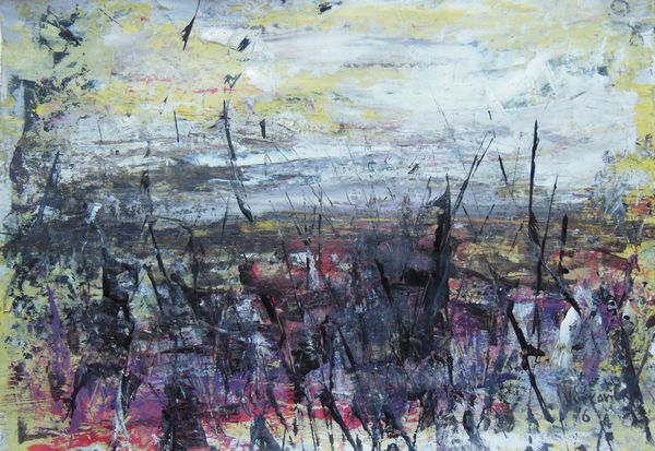 Curator: Here we have Nemanja Vučković's 2016 painting, "Autumn Day," rendered in acrylic. Editor: It’s a whirlwind of color, isn’t it? Very energetic. I immediately get a sense of churning—the application is so active. Curator: Indeed. The visible marks of the artist's hand speak volumes. The layering of acrylic tells a story of process, of application, and maybe even scraping away at points. It’s interesting to consider the material reality of its making and how this fits within the context of abstract expressionism. Editor: Abstract Expressionism it certainly evokes, doesn't it? The raw energy almost pushes this piece to Fauvism in some respects, doesn't it? To my mind, beyond the pure energy and mark-making, I detect some deliberate symbolism within it. What does autumn, as a motif, evoke? Transformation, the melancholy of change. I wonder if those blues near the bottom represent a water source; some connection to deeper unconscious emotions that run beneath our everyday awareness. Curator: It raises fascinating points about the interplay between representation and pure abstraction. Is Vučković attempting to capture a specific landscape or emotion? To me, it highlights how abstract painting blurs the lines between high art and craft. One has to appreciate the very labor that is visible in the application and blending and clashing of the color choices, really, the materiality on display, front and center. Editor: The artist allows you to see their working; the gestures create pathways that the viewer’s eye can then actively follow. It offers a fascinating window into cultural ideas associated with color and landscape. Curator: This piece invites a reflection on not just the aesthetic object itself but the means by which it came into existence, drawing on references to materials and methods used to make art since paint became something purchasable at scale for more people than ever before. Editor: I agree. It's powerful how such abstracted forms can stir so much. We really are seeing beyond just process and material here, too; we see some level of our collective past encoded within it, still relevant today.