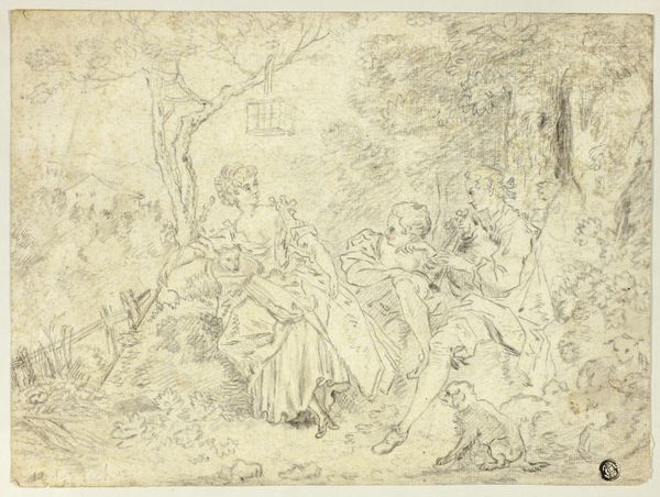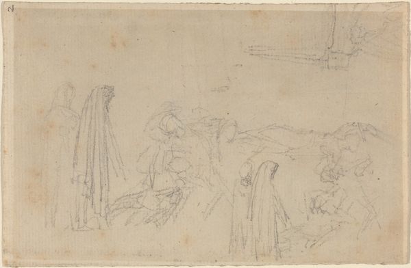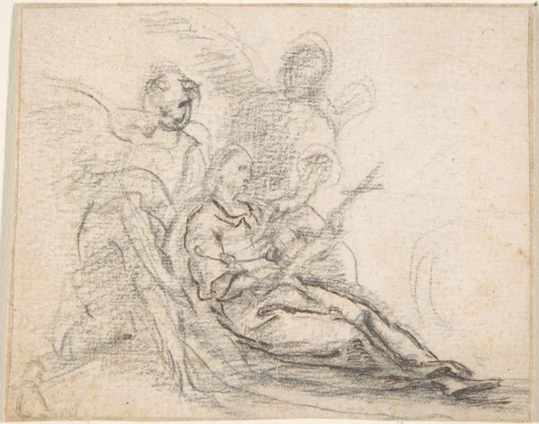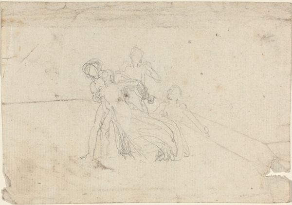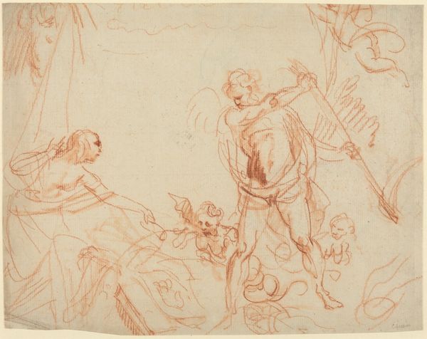 Curator: Immediately, there's something intriguing about the raw energy captured in this reddish-brown line drawing. It feels both intimate and monumental. Editor: I agree; that urgency emanates even through the fairly conventional history painting. I find myself focusing on who is centered, and why. Curator: You're right. Allow me to offer some context: what we’re observing is "The Birth of Pindar" by Giuseppe Bartolomeo Chiari, probably done between 1654 and 1727. Chiari was active during the Italian Renaissance, of course. Here, in these simple lines, we glimpse Pindar's auspicious beginning, with buzzing figures attending this symbolic event. Editor: Symbolic is definitely key here. Consider the figures’ placement – especially that figure stage right with an apparent infant or toddler trying to take center stage; what are we meant to feel as we consider what they represent, juxtaposed against a cultural obsession with virility and masculine intellect? What assumptions are we expected to accept? Curator: Exactly! This drawing shows Chiari's fluency in conveying dramatic narratives via classical imagery. He leans heavily on symbols – laurel wreaths suggesting future poetic accomplishments, gestures communicating prophecies and blessings... the conventional emblems of triumphant or historically significant figures. Editor: Emblems that create continuity. I notice the red chalk…a Baroque artist deploying an Italian Renaissance drawing style. It raises questions of how the art of antiquity gets resurrected at particular historical junctures. And, importantly, *who* is doing the resurrecting…and for what specific cultural or even political ends. I love that so many eras seem collapsed into this piece. Curator: Well, Chiari understood the importance of cultural memory and visual representation as cultural propaganda. The art movements create visual signifiers we automatically respond to—we recognize, even unconsciously, and replicate and disseminate across eras. Editor: Yes, and considering the social issues surrounding art's circulation even then helps unlock this work. Thank you. This has encouraged me to reconsider this drawing through multiple angles. Curator: For me, this discussion validates art's enduring power to activate dialogues. Hopefully, listeners have enjoyed joining this analysis.