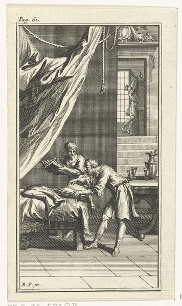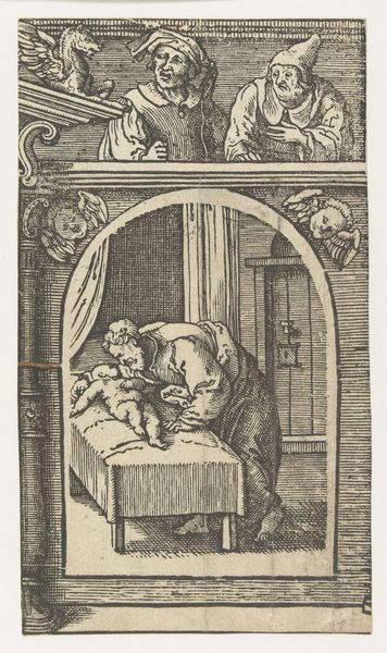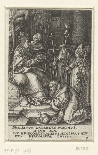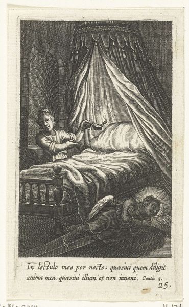 Curator: Sobering. My initial response is that this feels almost monastic in its austerity. What are your first thoughts? Editor: Immediately, I'm struck by the starkness of it. All those cross-hatched lines creating depth, and that skull just lying there… It’s like a little memento mori whispering in the corner. Very dramatic! Curator: Absolutely. This engraving by Christoffel van Sichem II, dated 1644, depicts Saint Melania the Younger as a hermit. Knowing Melania’s history as a Roman noblewoman who renounced her wealth to pursue a life of asceticism offers important context to this image. Editor: Renounced her wealth, huh? Now, that’s a statement! Looking at the image again, that austere setting suddenly feels less imposed and more chosen. She really went all in. Curator: Indeed. The print highlights her piety through specific visual cues, especially through the act of solitary prayer but also the inclusion of symbols like the crucifix and the skull as vanitas. These objects are, in their own way, visual critiques of the opulence Melania abandoned. Editor: It really grounds the saint in this kind of somber, reflective space. And thinking about the role of women and religion in 17th-century Dutch culture, I see how an image like this presents a particular kind of female empowerment – choosing spiritual devotion over worldly comforts, defining her own path outside of societal norms… Curator: Precisely. The historical backdrop cannot be overstated here; this piece invites an interrogation of class, gender and religious devotion. The portrayal of Melania directly challenges notions of prescribed feminine roles during this era. Editor: Okay, I'm totally with you. So, it's not just a pretty religious picture; it's a commentary, a challenge, a way of thinking about women’s choices then and maybe even now. That makes it feel surprisingly relevant. Curator: Exactly. We often box such depictions into their period, but what they tell us about agency and defiance has echoes through time. Editor: What began as a skull and some lines transforms into this potent image about choices and carving your own way. Who knew asceticism could be so radical? Curator: I suppose that's the power of art – revealing unexpected connections, reframing what we think we already understand. Editor: Agreed. Another layer peeled back! Thanks, Melania, and thanks, Christoffel van Sichem II!