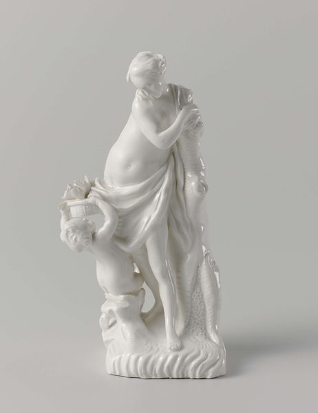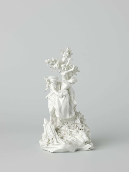 Editor: This little porcelain sculpture, created sometime between 1755 and 1780, is titled "Figure of a fruit picking woman," and just seems so delicate. What strikes me is how posed and performative this woman’s ‘labor’ appears to be. What’s your interpretation? Curator: That’s a great observation. When considering this piece historically, it's key to understand the Rococo period's fascination with pastoral themes. How do you think this romanticized view of rural life relates to the socio-political context of the time? Editor: I suppose it's kind of an escapist fantasy for the wealthy elite, maybe even a way to distance themselves from the realities of peasant life? Curator: Exactly! These porcelain figures, often displayed in the homes of the aristocracy, served as a kind of curated performance of an idealized world. What does it mean for art to participate in constructing those hierarchies and shielding those elites from uncomfortable realities? How does that compare with artistic practice today? Editor: Wow, I hadn't thought about it that way. The sculpture is beautiful, but its purpose seems to reinforce class divisions rather than bridge them. Does the whiteness of the porcelain tie into those politics? Curator: Yes, the pristine white porcelain was itself a symbol of wealth and status, attainable only by the upper classes, in direct opposition to the working class. And the small scale is critical, since these works existed in private space. It highlights the private consumption of art during the period. It's a visual reminder of who controls not just resources, but also narratives and representation. Editor: I see it now: this tiny, beautiful object tells a bigger story about power, class, and the ways art can both reflect and shape social perceptions. It gives me a new perspective on seemingly simple artworks. Curator: Absolutely! And remembering to examine those socio-political undercurrents will only make your readings of artworks richer moving forward.