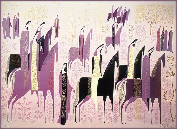 Eyvind Earle's "Central Park" presents us with a stylized vision of nature meeting urban architecture. The buildings loom as slender, stylized purple forms, reminiscent of gothic spires. Created during a time of rapid urbanization, the image offers a commentary on the relationship between the built environment and the natural world. Central Park, conceived in the 19th century, was intended as a democratic space, offering respite to all social classes amid the density of New York City. Earle's simplification of form, however, could suggest a critique of the way urban planning and institutionalized green spaces organize nature. Note the bridge over the water, dividing the painting. Is it a symbol of harmony, or of the uneasy tensions between nature and artifice? As art historians, we delve into period documents, landscape architecture archives, and urban planning theory to illuminate the social dialogues embedded in works like these. Art, in the end, is never just an aesthetic object; it's a reflection of our ever-evolving human landscape.