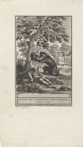 Curator: Oh, this is intense! I can almost smell the damp earth in this scene. It's a black and white engraving with remarkable precision. Is it me, or does that dark forest just drip with anxiety? Editor: Indeed. The emotional intensity is palpable. This is an engraving from 1779 by Reinier Vinkeles, titled "In een bos maakt een moordenaar zijn identiteit bekend aan zijn slachtoffer"—"In a forest, a murderer reveals his identity to his victim." A rather on-the-nose title, don't you think? The work can be found at the Rijksmuseum. It offers a dramatic depiction, reflecting Romanticism’s interest in extreme emotional states and morality. Curator: On-the-nose titles never bother me. Sometimes a wink and a nod is just what an artwork needs! But more seriously, there’s something quite theatrical about the composition – almost staged, wouldn’t you agree? It reminds me of those incredibly gruesome murder ballads. It captures that specific feeling, the quiet moments before the storm. Editor: Absolutely. Vinkeles masterfully utilizes the contrast between light and shadow. This creates a powerful sense of impending doom. The act of revealing identity speaks volumes about power, betrayal, and even class—we are looking at a familial betrayal that exposes broader moral failures embedded within structures of kinship and potentially, societal hierarchy. This is a potent narrative of the era, hinting at systemic rot beneath polite society. Curator: True! And beyond the obvious drama, look at the technical skill. It’s astounding—especially considering it's an engraving. All those tiny lines and hatching work together. It feels a bit like the artist himself is holding his breath, and letting all the dread wash through him and into the image. It is almost meditative to me, this moment when death, violence, and intimacy intersect. Editor: A fascinating take, especially emphasizing the meditative aspect amidst such violence. For me, though, this work forces consideration of accountability—it serves as a stern, gothic reminder that actions, especially those of violence and betrayal, leave indelible marks. Curator: A grim beauty that sticks with you, indeed. Editor: A dark corner of the soul, rendered visible.