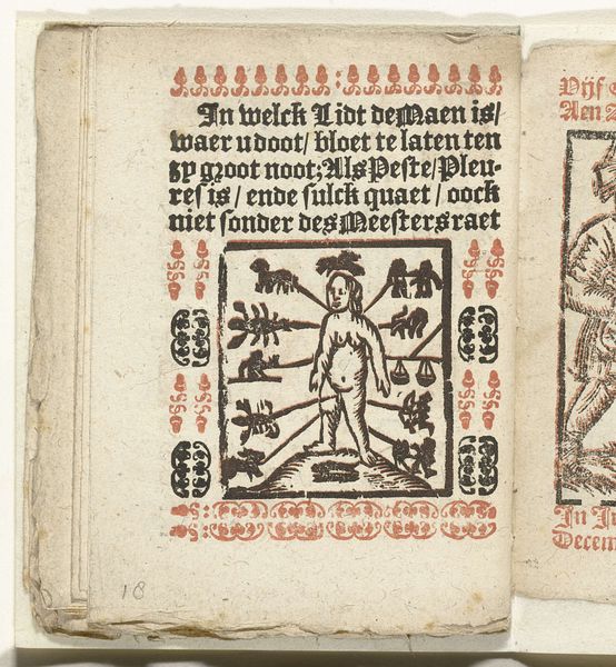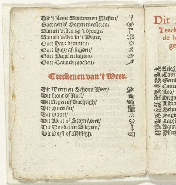 Curator: Looking at this image, the stark contrast between the black ink and the rough texture of the paper evokes a real sense of antiquity. It feels almost like peering into a lost world, doesn't it? Editor: Indeed. This is "Bladzijde met de symbolen voor de dagen van de week, 1712" or "Page with the Symbols for the Days of the Week, 1712," dating back to the early 18th century. It’s an early printed page by the widow Slegers. We’re looking at an intriguing example of early typography. Curator: The typography gives it an undeniably medieval aesthetic, despite its 1712 creation date, which already marks it for me as operating within complex webs of production and historical contexts. The combination of text and those minimalist symbols beneath them feels both functional and strangely beautiful. It's reminiscent of astronomical charts, perhaps meant for farmers seeking to plan and maximize growth cycles for a profitable season. Editor: Exactly. These kinds of printed calendars were incredibly important for both the everyday person. Notice how it connects the timing of agricultural tasks – "Sarpen/Planten" or ‘Scraping and Planting’ – with religious observances, or what the print maker here refers to as "Hepligh-Dagen." The positioning speaks volumes. Curator: Right, the alignment of religion, astrology, and early labor management speaks to the social and cultural organization during that time, in which faith played an instrumental role in the agrarian world. The very notion of "holy days," reminds us of how our social and economic lives, now mostly divorced, used to function according to shared beliefs and a sacred timeline. Editor: These symbols below, I imagine, gave even those who couldn’t read a key to the week's significant dates. It's also fascinating how even something seemingly utilitarian becomes a vehicle for cultural memory and visual symbolism, a tool for social structures to take hold. Curator: Thinking about accessibility for a mostly illiterate public provides interesting points of connection to our own age of symbolic social communication in digital platforms: hashtags, emojis. Here, each choice speaks of very old means to produce widely understandable, shared experience of identity, in its connection to work and ritual, both crucial to shaping individual as collective understandings. Editor: Indeed. Looking closely at "Bladzijde met de symbolen voor de dagen van de week" allows us to examine the history of knowledge dissemination, and understand that people from that period are both quite like us, and incredibly foreign.