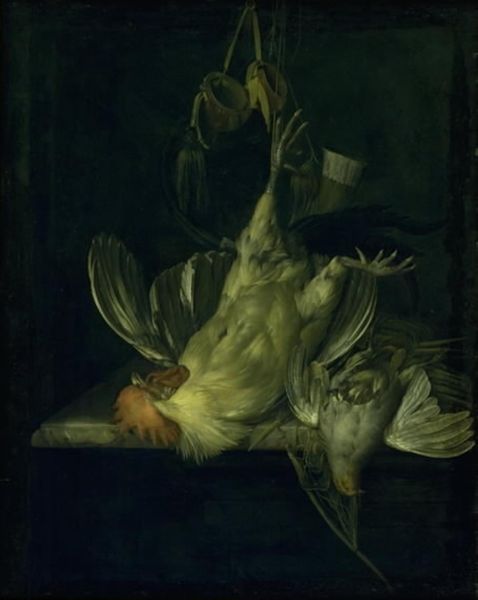 Curator: So, here we have "Still Life with Fish on a Stone Table," believed to be painted by Abraham van Beijeren sometime between 1635 and 1690. It's currently held in the collection of the SMK, the Statens Museum for Kunst. What are your initial thoughts? Editor: My first thought is—it's a bit...gruesome. I mean, technically brilliant, but the dead eyes of those fish, the raw slice of salmon—it feels less like a celebration of bounty and more like a cautionary tale. Is it just me getting a memento mori vibe? Curator: It is difficult to separate those two things out, the presentation of food as a display of plenty and the ever-present understanding of mortality, of nature's cyclical patterns. I think what's really compelling here is the artist's almost scientific dedication to rendering texture and light. Look at the scales, each catching light in its own unique way, or the wet, almost slimy sheen on the skate. It speaks to a very acute observation of the natural world. Editor: Absolutely. And there’s that single crab leg jutting out, a sort of 'peek-a-boo' of decay, suggesting nothing lasts, all food disappears after a certain moment. What strikes me too, is the arrangement itself, kind of precariously piled. Deliberately unstable? Curator: Perhaps, a deliberate demonstration of painterly virtuosity! To masterfully depict something about to tumble creates an interesting dynamic. It plays with the genre expectations a bit. Still lifes of this era tend to convey an idea of stable, ordered prosperity. But here the precarious nature makes for interesting contemplation of transience. Editor: And that darkness! It is like a velvet curtain about to be drawn, just waiting for the fishmonger to leave his shop...Van Beijeren seems to use shadow almost as another character. He might be the true lead in the arrangement. Curator: The chiaroscuro is quite intense; it heightens the realism and the drama. Focusing on just the color, one could make a fairly direct link to developments in the broader Baroque period—using light and shadow to direct the viewer's gaze. Van Beijeren’s manipulation draws you into the scene. Editor: Right. The Dutch Golden Age. But golden for whom, right? Those contrasts! And while all this analysis helps... I keep coming back to those fish eyes! They're haunting. Maybe this painting isn't about skill so much as confronting our own fleeting existence? Curator: I agree, in the end the still life as a genre lends itself to multiple interpretations precisely because of the tensions between presentation and representation. It provides fertile ground for reflection. Editor: Okay, good. I'm glad the fish eyes weren't just talking to me.
