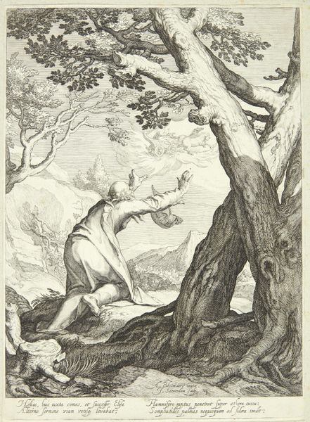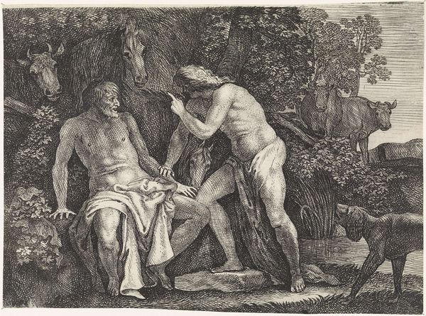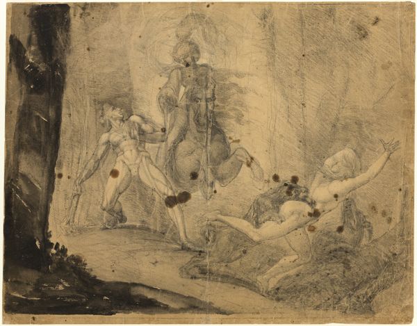 Editor: Thomas Sully's oil painting, "Saving the Life of Friday," really strikes me with its raw energy. The brushstrokes are so loose, and the figures almost seem to blend into the landscape. It feels frantic, like we're right in the middle of the action. What do you see in this piece? Curator: I see a powerful commentary on colonialism and the "civilizing mission" often used to justify it. "Saving the Life of Friday" depicts a key scene from Daniel Defoe’s "Robinson Crusoe," but through Sully's lens, we can interrogate the power dynamics at play. Note the pose of Crusoe, shielding Friday – it suggests a paternalistic protection, a relationship of inherent inequality masked as benevolence. Editor: I hadn't thought about it that way. So, it's not just an adventure story? Curator: Precisely. Consider how Friday's depiction reinforces the stereotype of the "noble savage," perpetually needing the guidance and intervention of the European colonizer. Sully, whether intentionally or not, perpetuates a problematic narrative. The romantic landscape, seemingly wild and untamed, also symbolizes the colonizer's desire to conquer and control nature and its inhabitants. How does the painterly style further underscore this? Editor: The blurry details almost suggest a dreamlike state or perhaps highlight the subjective experience of Crusoe himself? It’s not necessarily a realistic portrayal but a dramatized memory with his perspective. Curator: Exactly. The Romantics weren't aiming for pure realism; they explored emotional truths. Sully, though, reflects and perhaps subtly critiques the narratives that uphold colonialism by representing the historical biases and assumptions present during that time. Editor: This makes me see the painting in a completely different light. I'll definitely have to revisit my understanding of "Robinson Crusoe" now too. Curator: And that's the point, isn't it? To challenge perspectives, unpack narratives, and strive for more equitable interpretations of art and the history it reflects.